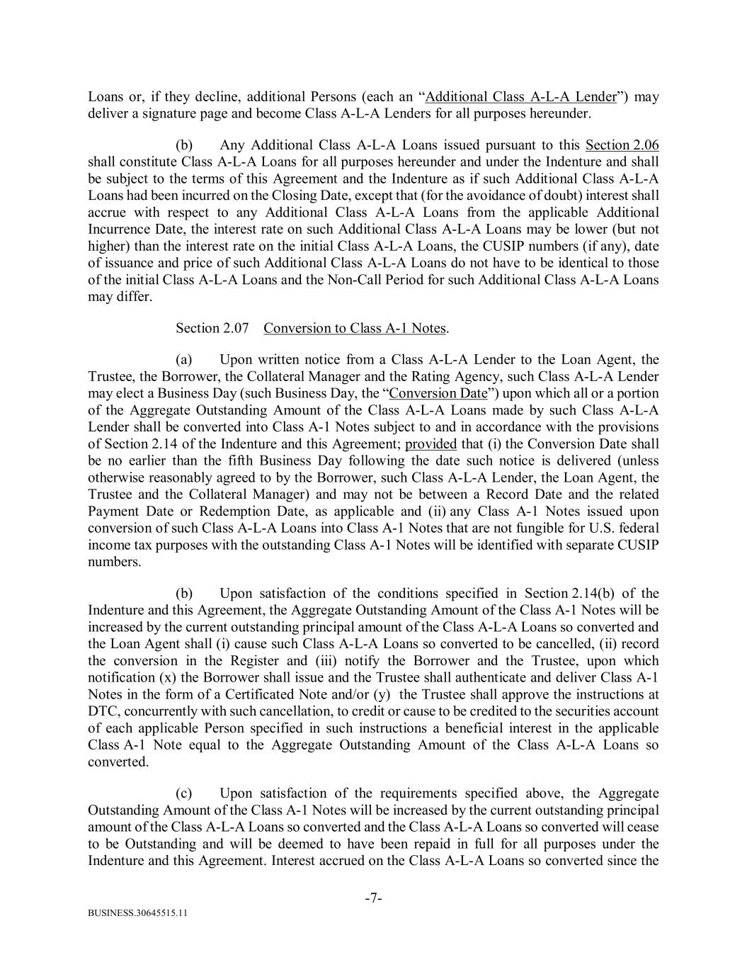 BUSINESS.30645515.11 -7- Loans or, if they decline, additional Persons (each an “Additional Class A-L-A Lender”) may deliver a signature page and become Class A-L-A Lenders for all purposes hereunder. (b) Any Additional Class A-L-A Loans issued pursuant to this Section 2.06 shall constitute Class A-L-A Loans for all purposes hereunder and under the Indenture and shall be subject to the terms of this Agreement and the Indenture as if such Additional Class A-L-A Loans had been incurred on the Closing Date, except that (for the avoidance of doubt) interest shall accrue with respect to any Additional Class A-L-A Loans from the applicable Additional Incurrence Date, the interest rate on such Additional Class A-L-A Loans may be lower (but not higher) than the interest rate on the initial Class A-L-A Loans, the CUSIP numbers (if any), date of issuance and price of such Additional Class A-L-A Loans do not have to be identical to those of the initial Class A-L-A Loans and the Non-Call Period for such Additional Class A-L-A Loans may differ. Section 2.07 Conversion to Class A-1 Notes. (a) Upon written notice from a Class A-L-A Lender to the Loan Agent, the Trustee, the Borrower, the Collateral Manager and the Rating Agency, such Class A-L-A Lender may elect a Business Day (such Business Day, the “Conversion Date”) upon which all or a portion of the Aggregate Outstanding Amount of the Class A-L-A Loans made by such Class A-L-A Lender shall be converted into Class A-1 Notes subject to and in accordance with the provisions of Section 2.14 of the Indenture and this Agreement; provided that (i) the Conversion Date shall be no earlier than the fifth Business Day following the date such notice is delivered (unless otherwise reasonably agreed to by the Borrower, such Class A-L-A Lender, the Loan Agent, the Trustee and the Collateral Manager) and may not be between a Record Date and the related Payment Date or Redemption Date, as applicable and (ii) any Class A-1 Notes issued upon conversion of such Class A-L-A Loans into Class A-1 Notes that are not fungible for U.S. federal income tax purposes with the outstanding Class A-1 Notes will be identified with separate CUSIP numbers. (b) Upon satisfaction of the conditions specified in Section 2.14(b) of the Indenture and this Agreement, the Aggregate Outstanding Amount of the Class A-1 Notes will be increased by the current outstanding principal amount of the Class A-L-A Loans so converted and the Loan Agent shall (i) cause such Class A-L-A Loans so converted to be cancelled, (ii) record the conversion in the Register and (iii) notify the Borrower and the Trustee, upon which notification (x) the Borrower shall issue and the Trustee shall authenticate and deliver Class A-1 Notes in the form of a Certificated Note and/or (y) the Trustee shall approve the instructions at DTC, concurrently with such cancellation, to credit or cause to be credited to the securities account of each applicable Person specified in such instructions a beneficial interest in the applicable Class A-1 Note equal to the Aggregate Outstanding Amount of the Class A-L-A Loans so converted. (c) Upon satisfaction of the requirements specified above, the Aggregate Outstanding Amount of the Class A-1 Notes will be increased by the current outstanding principal amount of the Class A-L-A Loans so converted and the Class A-L-A Loans so converted will cease to be Outstanding and will be deemed to have been repaid in full for all purposes under the Indenture and this Agreement. Interest accrued on the Class A-L-A Loans so converted since the