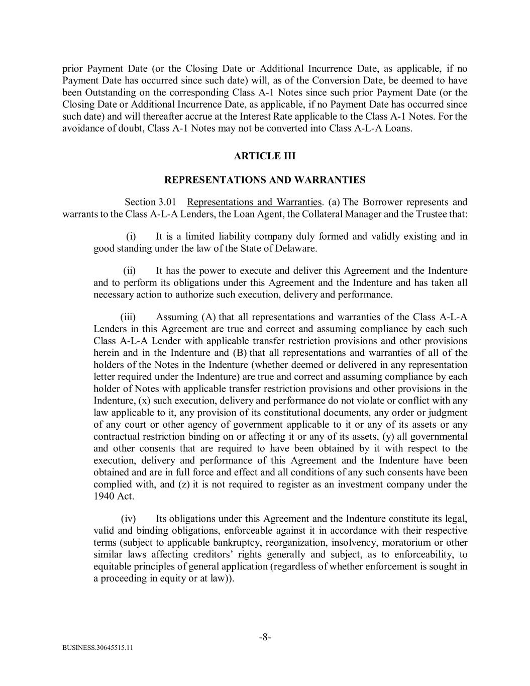 BUSINESS.30645515.11 -8- prior Payment Date (or the Closing Date or Additional Incurrence Date, as applicable, if no Payment Date has occurred since such date) will, as of the Conversion Date, be deemed to have been Outstanding on the corresponding Class A-1 Notes since such prior Payment Date (or the Closing Date or Additional Incurrence Date, as applicable, if no Payment Date has occurred since such date) and will thereafter accrue at the Interest Rate applicable to the Class A-1 Notes. For the avoidance of doubt, Class A-1 Notes may not be converted into Class A-L-A Loans. ARTICLE III REPRESENTATIONS AND WARRANTIES Section 3.01 Representations and Warranties. (a) The Borrower represents and warrants to the Class A-L-A Lenders, the Loan Agent, the Collateral Manager and the Trustee that: (i) It is a limited liability company duly formed and validly existing and in good standing under the law of the State of Delaware. (ii) It has the power to execute and deliver this Agreement and the Indenture and to perform its obligations under this Agreement and the Indenture and has taken all necessary action to authorize such execution, delivery and performance. (iii) Assuming (A) that all representations and warranties of the Class A-L-A Lenders in this Agreement are true and correct and assuming compliance by each such Class A-L-A Lender with applicable transfer restriction provisions and other provisions herein and in the Indenture and (B) that all representations and warranties of all of the holders of the Notes in the Indenture (whether deemed or delivered in any representation letter required under the Indenture) are true and correct and assuming compliance by each holder of Notes with applicable transfer restriction provisions and other provisions in the Indenture, (x) such execution, delivery and performance do not violate or conflict with any law applicable to it, any provision of its constitutional documents, any order or judgment of any court or other agency of government applicable to it or any of its assets or any contractual restriction binding on or affecting it or any of its assets, (y) all governmental and other consents that are required to have been obtained by it with respect to the execution, delivery and performance of this Agreement and the Indenture have been obtained and are in full force and effect and all conditions of any such consents have been complied with, and (z) it is not required to register as an investment company under the 1940 Act. (iv) Its obligations under this Agreement and the Indenture constitute its legal, valid and binding obligations, enforceable against it in accordance with their respective terms (subject to applicable bankruptcy, reorganization, insolvency, moratorium or other similar laws affecting creditors’ rights generally and subject, as to enforceability, to equitable principles of general application (regardless of whether enforcement is sought in a proceeding in equity or at law)).