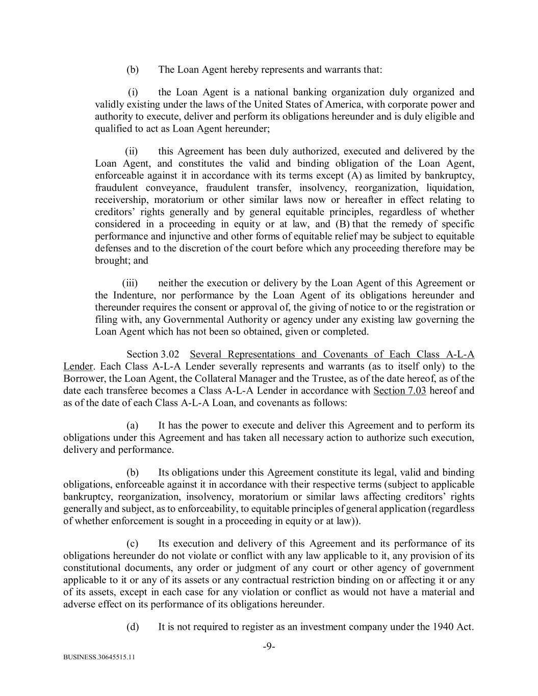 BUSINESS.30645515.11 -9- (b) The Loan Agent hereby represents and warrants that: (i) the Loan Agent is a national banking organization duly organized and validly existing under the laws of the United States of America, with corporate power and authority to execute, deliver and perform its obligations hereunder and is duly eligible and qualified to act as Loan Agent hereunder; (ii) this Agreement has been duly authorized, executed and delivered by the Loan Agent, and constitutes the valid and binding obligation of the Loan Agent, enforceable against it in accordance with its terms except (A) as limited by bankruptcy, fraudulent conveyance, fraudulent transfer, insolvency, reorganization, liquidation, receivership, moratorium or other similar laws now or hereafter in effect relating to creditors’ rights generally and by general equitable principles, regardless of whether considered in a proceeding in equity or at law, and (B) that the remedy of specific performance and injunctive and other forms of equitable relief may be subject to equitable defenses and to the discretion of the court before which any proceeding therefore may be brought; and (iii) neither the execution or delivery by the Loan Agent of this Agreement or the Indenture, nor performance by the Loan Agent of its obligations hereunder and thereunder requires the consent or approval of, the giving of notice to or the registration or filing with, any Governmental Authority or agency under any existing law governing the Loan Agent which has not been so obtained, given or completed. Section 3.02 Several Representations and Covenants of Each Class A-L-A Lender. Each Class A-L-A Lender severally represents and warrants (as to itself only) to the Borrower, the Loan Agent, the Collateral Manager and the Trustee, as of the date hereof, as of the date each transferee becomes a Class A-L-A Lender in accordance with Section 7.03 hereof and as of the date of each Class A-L-A Loan, and covenants as follows: (a) It has the power to execute and deliver this Agreement and to perform its obligations under this Agreement and has taken all necessary action to authorize such execution, delivery and performance. (b) Its obligations under this Agreement constitute its legal, valid and binding obligations, enforceable against it in accordance with their respective terms (subject to applicable bankruptcy, reorganization, insolvency, moratorium or similar laws affecting creditors’ rights generally and subject, as to enforceability, to equitable principles of general application (regardless of whether enforcement is sought in a proceeding in equity or at law)). (c) Its execution and delivery of this Agreement and its performance of its obligations hereunder do not violate or conflict with any law applicable to it, any provision of its constitutional documents, any order or judgment of any court or other agency of government applicable to it or any of its assets or any contractual restriction binding on or affecting it or any of its assets, except in each case for any violation or conflict as would not have a material and adverse effect on its performance of its obligations hereunder. (d) It is not required to register as an investment company under the 1940 Act.