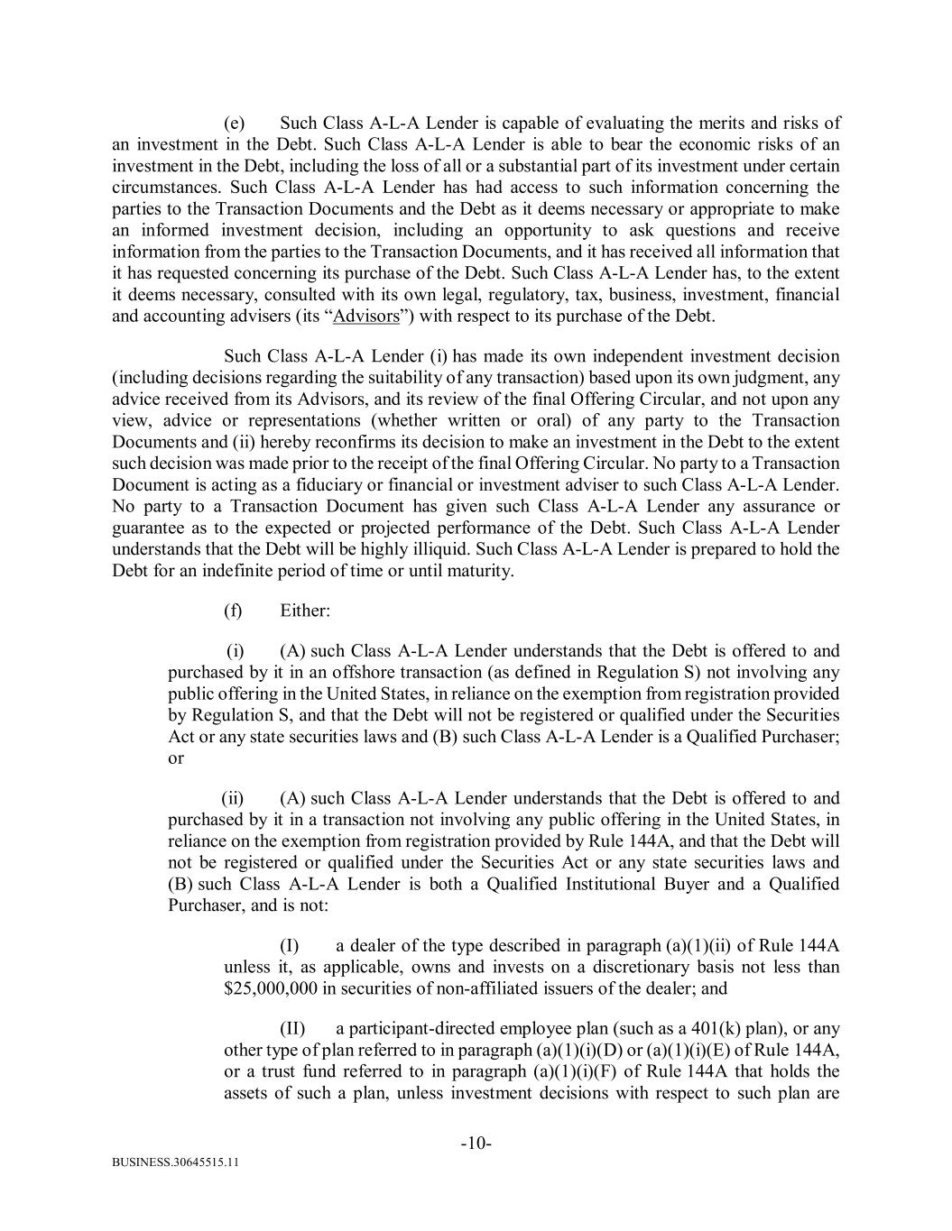 BUSINESS.30645515.11 -10- (e) Such Class A-L-A Lender is capable of evaluating the merits and risks of an investment in the Debt. Such Class A-L-A Lender is able to bear the economic risks of an investment in the Debt, including the loss of all or a substantial part of its investment under certain circumstances. Such Class A-L-A Lender has had access to such information concerning the parties to the Transaction Documents and the Debt as it deems necessary or appropriate to make an informed investment decision, including an opportunity to ask questions and receive information from the parties to the Transaction Documents, and it has received all information that it has requested concerning its purchase of the Debt. Such Class A-L-A Lender has, to the extent it deems necessary, consulted with its own legal, regulatory, tax, business, investment, financial and accounting advisers (its “Advisors”) with respect to its purchase of the Debt. Such Class A-L-A Lender (i) has made its own independent investment decision (including decisions regarding the suitability of any transaction) based upon its own judgment, any advice received from its Advisors, and its review of the final Offering Circular, and not upon any view, advice or representations (whether written or oral) of any party to the Transaction Documents and (ii) hereby reconfirms its decision to make an investment in the Debt to the extent such decision was made prior to the receipt of the final Offering Circular. No party to a Transaction Document is acting as a fiduciary or financial or investment adviser to such Class A-L-A Lender. No party to a Transaction Document has given such Class A-L-A Lender any assurance or guarantee as to the expected or projected performance of the Debt. Such Class A-L-A Lender understands that the Debt will be highly illiquid. Such Class A-L-A Lender is prepared to hold the Debt for an indefinite period of time or until maturity. (f) Either: (i) (A) such Class A-L-A Lender understands that the Debt is offered to and purchased by it in an offshore transaction (as defined in Regulation S) not involving any public offering in the United States, in reliance on the exemption from registration provided by Regulation S, and that the Debt will not be registered or qualified under the Securities Act or any state securities laws and (B) such Class A-L-A Lender is a Qualified Purchaser; or (ii) (A) such Class A-L-A Lender understands that the Debt is offered to and purchased by it in a transaction not involving any public offering in the United States, in reliance on the exemption from registration provided by Rule 144A, and that the Debt will not be registered or qualified under the Securities Act or any state securities laws and (B) such Class A-L-A Lender is both a Qualified Institutional Buyer and a Qualified Purchaser, and is not: (I) a dealer of the type described in paragraph (a)(1)(ii) of Rule 144A unless it, as applicable, owns and invests on a discretionary basis not less than $25,000,000 in securities of non-affiliated issuers of the dealer; and (II) a participant-directed employee plan (such as a 401(k) plan), or any other type of plan referred to in paragraph (a)(1)(i)(D) or (a)(1)(i)(E) of Rule 144A, or a trust fund referred to in paragraph (a)(1)(i)(F) of Rule 144A that holds the assets of such a plan, unless investment decisions with respect to such plan are