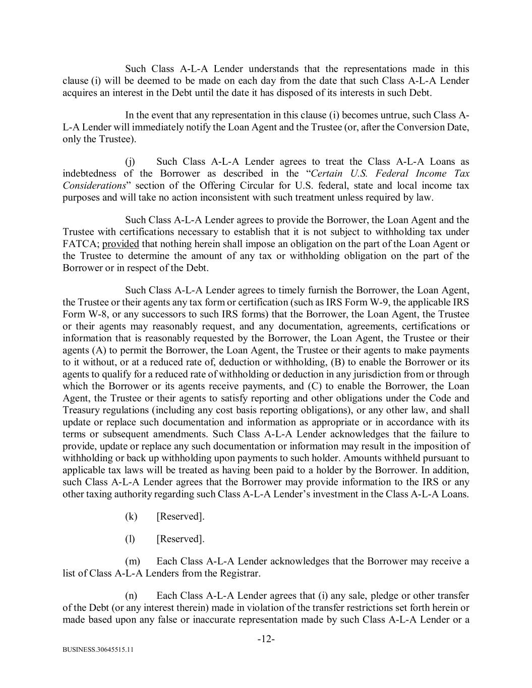 BUSINESS.30645515.11 -12- Such Class A-L-A Lender understands that the representations made in this clause (i) will be deemed to be made on each day from the date that such Class A-L-A Lender acquires an interest in the Debt until the date it has disposed of its interests in such Debt. In the event that any representation in this clause (i) becomes untrue, such Class A- L-A Lender will immediately notify the Loan Agent and the Trustee (or, after the Conversion Date, only the Trustee). (j) Such Class A-L-A Lender agrees to treat the Class A-L-A Loans as indebtedness of the Borrower as described in the “Certain U.S. Federal Income Tax Considerations” section of the Offering Circular for U.S. federal, state and local income tax purposes and will take no action inconsistent with such treatment unless required by law. Such Class A-L-A Lender agrees to provide the Borrower, the Loan Agent and the Trustee with certifications necessary to establish that it is not subject to withholding tax under FATCA; provided that nothing herein shall impose an obligation on the part of the Loan Agent or the Trustee to determine the amount of any tax or withholding obligation on the part of the Borrower or in respect of the Debt. Such Class A-L-A Lender agrees to timely furnish the Borrower, the Loan Agent, the Trustee or their agents any tax form or certification (such as IRS Form W-9, the applicable IRS Form W-8, or any successors to such IRS forms) that the Borrower, the Loan Agent, the Trustee or their agents may reasonably request, and any documentation, agreements, certifications or information that is reasonably requested by the Borrower, the Loan Agent, the Trustee or their agents (A) to permit the Borrower, the Loan Agent, the Trustee or their agents to make payments to it without, or at a reduced rate of, deduction or withholding, (B) to enable the Borrower or its agents to qualify for a reduced rate of withholding or deduction in any jurisdiction from or through which the Borrower or its agents receive payments, and (C) to enable the Borrower, the Loan Agent, the Trustee or their agents to satisfy reporting and other obligations under the Code and Treasury regulations (including any cost basis reporting obligations), or any other law, and shall update or replace such documentation and information as appropriate or in accordance with its terms or subsequent amendments. Such Class A-L-A Lender acknowledges that the failure to provide, update or replace any such documentation or information may result in the imposition of withholding or back up withholding upon payments to such holder. Amounts withheld pursuant to applicable tax laws will be treated as having been paid to a holder by the Borrower. In addition, such Class A-L-A Lender agrees that the Borrower may provide information to the IRS or any other taxing authority regarding such Class A-L-A Lender’s investment in the Class A-L-A Loans. (k) [Reserved]. (l) [Reserved]. (m) Each Class A-L-A Lender acknowledges that the Borrower may receive a list of Class A-L-A Lenders from the Registrar. (n) Each Class A-L-A Lender agrees that (i) any sale, pledge or other transfer of the Debt (or any interest therein) made in violation of the transfer restrictions set forth herein or made based upon any false or inaccurate representation made by such Class A-L-A Lender or a