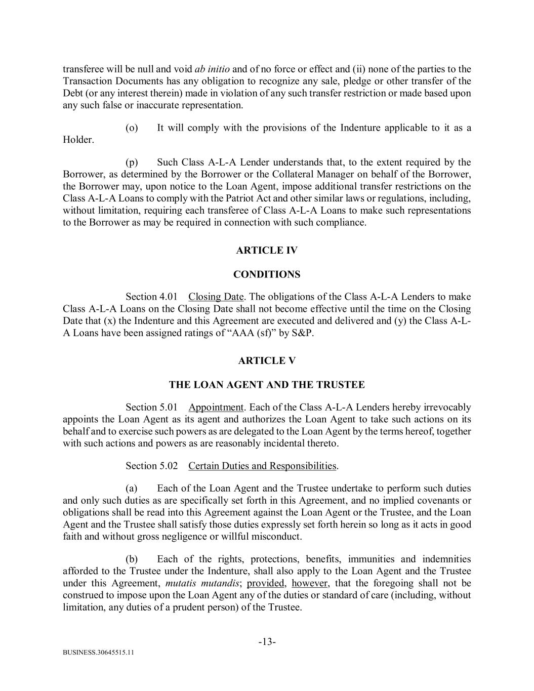 BUSINESS.30645515.11 -13- transferee will be null and void ab initio and of no force or effect and (ii) none of the parties to the Transaction Documents has any obligation to recognize any sale, pledge or other transfer of the Debt (or any interest therein) made in violation of any such transfer restriction or made based upon any such false or inaccurate representation. (o) It will comply with the provisions of the Indenture applicable to it as a Holder. (p) Such Class A-L-A Lender understands that, to the extent required by the Borrower, as determined by the Borrower or the Collateral Manager on behalf of the Borrower, the Borrower may, upon notice to the Loan Agent, impose additional transfer restrictions on the Class A-L-A Loans to comply with the Patriot Act and other similar laws or regulations, including, without limitation, requiring each transferee of Class A-L-A Loans to make such representations to the Borrower as may be required in connection with such compliance. ARTICLE IV CONDITIONS Section 4.01 Closing Date. The obligations of the Class A-L-A Lenders to make Class A-L-A Loans on the Closing Date shall not become effective until the time on the Closing Date that (x) the Indenture and this Agreement are executed and delivered and (y) the Class A-L- A Loans have been assigned ratings of “AAA (sf)” by S&P. ARTICLE V THE LOAN AGENT AND THE TRUSTEE Section 5.01 Appointment. Each of the Class A-L-A Lenders hereby irrevocably appoints the Loan Agent as its agent and authorizes the Loan Agent to take such actions on its behalf and to exercise such powers as are delegated to the Loan Agent by the terms hereof, together with such actions and powers as are reasonably incidental thereto. Section 5.02 Certain Duties and Responsibilities. (a) Each of the Loan Agent and the Trustee undertake to perform such duties and only such duties as are specifically set forth in this Agreement, and no implied covenants or obligations shall be read into this Agreement against the Loan Agent or the Trustee, and the Loan Agent and the Trustee shall satisfy those duties expressly set forth herein so long as it acts in good faith and without gross negligence or willful misconduct. (b) Each of the rights, protections, benefits, immunities and indemnities afforded to the Trustee under the Indenture, shall also apply to the Loan Agent and the Trustee under this Agreement, mutatis mutandis; provided, however, that the foregoing shall not be construed to impose upon the Loan Agent any of the duties or standard of care (including, without limitation, any duties of a prudent person) of the Trustee.
