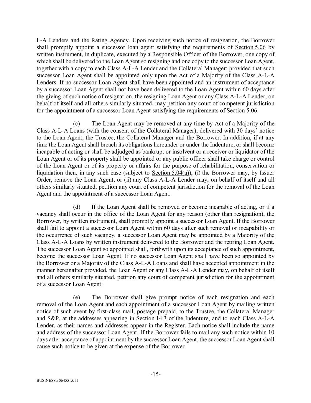 BUSINESS.30645515.11 -15- L-A Lenders and the Rating Agency. Upon receiving such notice of resignation, the Borrower shall promptly appoint a successor loan agent satisfying the requirements of Section 5.06 by written instrument, in duplicate, executed by a Responsible Officer of the Borrower, one copy of which shall be delivered to the Loan Agent so resigning and one copy to the successor Loan Agent, together with a copy to each Class A-L-A Lender and the Collateral Manager; provided that such successor Loan Agent shall be appointed only upon the Act of a Majority of the Class A-L-A Lenders. If no successor Loan Agent shall have been appointed and an instrument of acceptance by a successor Loan Agent shall not have been delivered to the Loan Agent within 60 days after the giving of such notice of resignation, the resigning Loan Agent or any Class A-L-A Lender, on behalf of itself and all others similarly situated, may petition any court of competent jurisdiction for the appointment of a successor Loan Agent satisfying the requirements of Section 5.06. (c) The Loan Agent may be removed at any time by Act of a Majority of the Class A-L-A Loans (with the consent of the Collateral Manager), delivered with 30 days’ notice to the Loan Agent, the Trustee, the Collateral Manager and the Borrower. In addition, if at any time the Loan Agent shall breach its obligations hereunder or under the Indenture, or shall become incapable of acting or shall be adjudged as bankrupt or insolvent or a receiver or liquidator of the Loan Agent or of its property shall be appointed or any public officer shall take charge or control of the Loan Agent or of its property or affairs for the purpose of rehabilitation, conservation or liquidation then, in any such case (subject to Section 5.04(a)), (i) the Borrower may, by Issuer Order, remove the Loan Agent, or (ii) any Class A-L-A Lender may, on behalf of itself and all others similarly situated, petition any court of competent jurisdiction for the removal of the Loan Agent and the appointment of a successor Loan Agent. (d) If the Loan Agent shall be removed or become incapable of acting, or if a vacancy shall occur in the office of the Loan Agent for any reason (other than resignation), the Borrower, by written instrument, shall promptly appoint a successor Loan Agent. If the Borrower shall fail to appoint a successor Loan Agent within 60 days after such removal or incapability or the occurrence of such vacancy, a successor Loan Agent may be appointed by a Majority of the Class A-L-A Loans by written instrument delivered to the Borrower and the retiring Loan Agent. The successor Loan Agent so appointed shall, forthwith upon its acceptance of such appointment, become the successor Loan Agent. If no successor Loan Agent shall have been so appointed by the Borrower or a Majority of the Class A-L-A Loans and shall have accepted appointment in the manner hereinafter provided, the Loan Agent or any Class A-L-A Lender may, on behalf of itself and all others similarly situated, petition any court of competent jurisdiction for the appointment of a successor Loan Agent. (e) The Borrower shall give prompt notice of each resignation and each removal of the Loan Agent and each appointment of a successor Loan Agent by mailing written notice of such event by first-class mail, postage prepaid, to the Trustee, the Collateral Manager and S&P, at the addresses appearing in Section 14.3 of the Indenture, and to each Class A-L-A Lender, as their names and addresses appear in the Register. Each notice shall include the name and address of the successor Loan Agent. If the Borrower fails to mail any such notice within 10 days after acceptance of appointment by the successor Loan Agent, the successor Loan Agent shall cause such notice to be given at the expense of the Borrower.