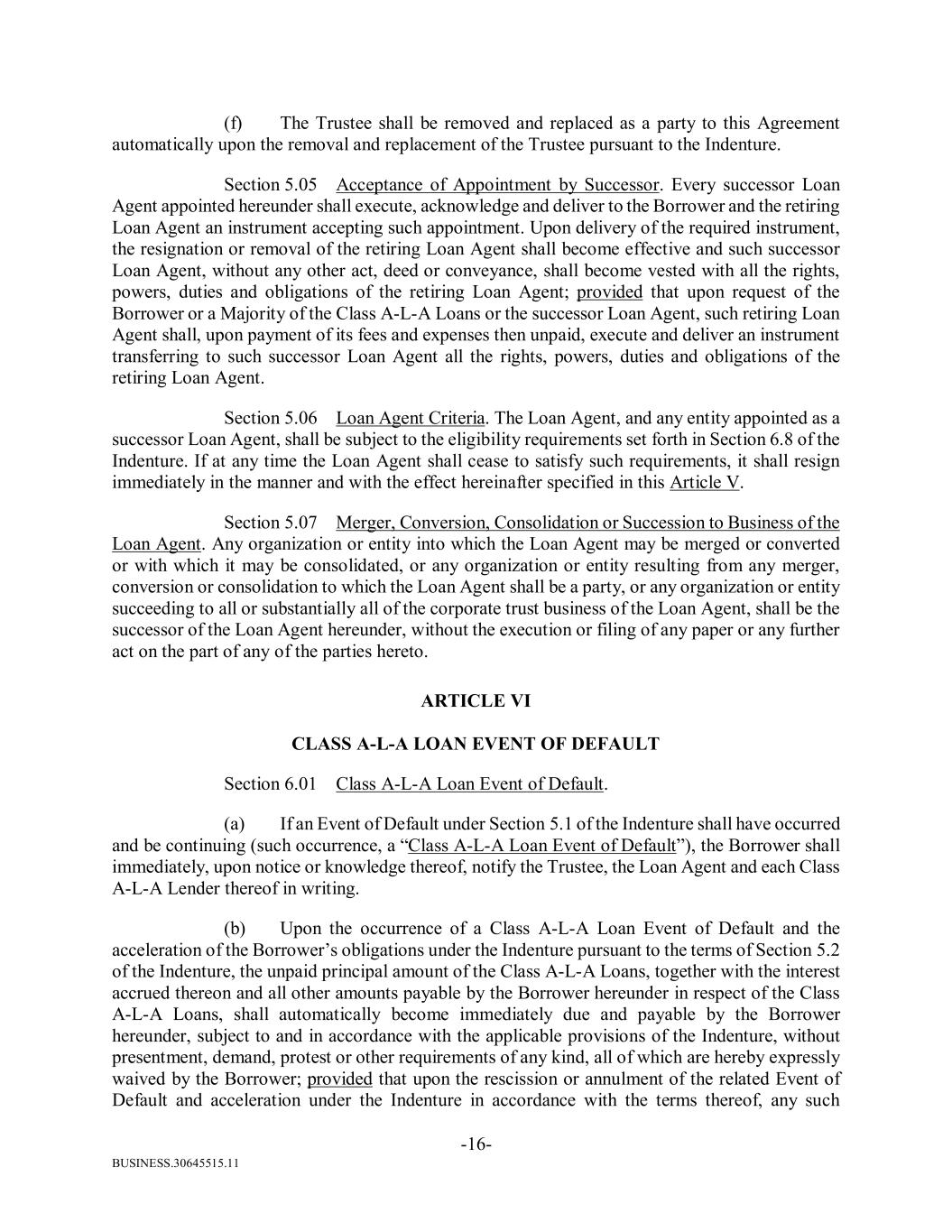 BUSINESS.30645515.11 -16- (f) The Trustee shall be removed and replaced as a party to this Agreement automatically upon the removal and replacement of the Trustee pursuant to the Indenture. Section 5.05 Acceptance of Appointment by Successor. Every successor Loan Agent appointed hereunder shall execute, acknowledge and deliver to the Borrower and the retiring Loan Agent an instrument accepting such appointment. Upon delivery of the required instrument, the resignation or removal of the retiring Loan Agent shall become effective and such successor Loan Agent, without any other act, deed or conveyance, shall become vested with all the rights, powers, duties and obligations of the retiring Loan Agent; provided that upon request of the Borrower or a Majority of the Class A-L-A Loans or the successor Loan Agent, such retiring Loan Agent shall, upon payment of its fees and expenses then unpaid, execute and deliver an instrument transferring to such successor Loan Agent all the rights, powers, duties and obligations of the retiring Loan Agent. Section 5.06 Loan Agent Criteria. The Loan Agent, and any entity appointed as a successor Loan Agent, shall be subject to the eligibility requirements set forth in Section 6.8 of the Indenture. If at any time the Loan Agent shall cease to satisfy such requirements, it shall resign immediately in the manner and with the effect hereinafter specified in this Article V. Section 5.07 Merger, Conversion, Consolidation or Succession to Business of the Loan Agent. Any organization or entity into which the Loan Agent may be merged or converted or with which it may be consolidated, or any organization or entity resulting from any merger, conversion or consolidation to which the Loan Agent shall be a party, or any organization or entity succeeding to all or substantially all of the corporate trust business of the Loan Agent, shall be the successor of the Loan Agent hereunder, without the execution or filing of any paper or any further act on the part of any of the parties hereto. ARTICLE VI CLASS A-L-A LOAN EVENT OF DEFAULT Section 6.01 Class A-L-A Loan Event of Default. (a) If an Event of Default under Section 5.1 of the Indenture shall have occurred and be continuing (such occurrence, a “Class A-L-A Loan Event of Default”), the Borrower shall immediately, upon notice or knowledge thereof, notify the Trustee, the Loan Agent and each Class A-L-A Lender thereof in writing. (b) Upon the occurrence of a Class A-L-A Loan Event of Default and the acceleration of the Borrower’s obligations under the Indenture pursuant to the terms of Section 5.2 of the Indenture, the unpaid principal amount of the Class A-L-A Loans, together with the interest accrued thereon and all other amounts payable by the Borrower hereunder in respect of the Class A-L-A Loans, shall automatically become immediately due and payable by the Borrower hereunder, subject to and in accordance with the applicable provisions of the Indenture, without presentment, demand, protest or other requirements of any kind, all of which are hereby expressly waived by the Borrower; provided that upon the rescission or annulment of the related Event of Default and acceleration under the Indenture in accordance with the terms thereof, any such
