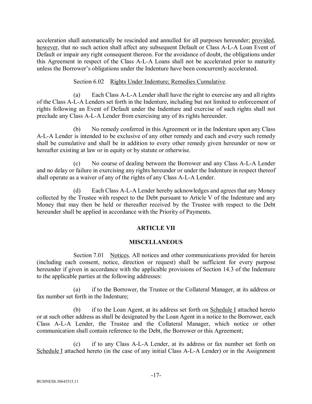 BUSINESS.30645515.11 -17- acceleration shall automatically be rescinded and annulled for all purposes hereunder; provided, however, that no such action shall affect any subsequent Default or Class A-L-A Loan Event of Default or impair any right consequent thereon. For the avoidance of doubt, the obligations under this Agreement in respect of the Class A-L-A Loans shall not be accelerated prior to maturity unless the Borrower’s obligations under the Indenture have been concurrently accelerated. Section 6.02 Rights Under Indenture; Remedies Cumulative. (a) Each Class A-L-A Lender shall have the right to exercise any and all rights of the Class A-L-A Lenders set forth in the Indenture, including but not limited to enforcement of rights following an Event of Default under the Indenture and exercise of such rights shall not preclude any Class A-L-A Lender from exercising any of its rights hereunder. (b) No remedy conferred in this Agreement or in the Indenture upon any Class A-L-A Lender is intended to be exclusive of any other remedy and each and every such remedy shall be cumulative and shall be in addition to every other remedy given hereunder or now or hereafter existing at law or in equity or by statute or otherwise. (c) No course of dealing between the Borrower and any Class A-L-A Lender and no delay or failure in exercising any rights hereunder or under the Indenture in respect thereof shall operate as a waiver of any of the rights of any Class A-L-A Lender. (d) Each Class A-L-A Lender hereby acknowledges and agrees that any Money collected by the Trustee with respect to the Debt pursuant to Article V of the Indenture and any Money that may then be held or thereafter received by the Trustee with respect to the Debt hereunder shall be applied in accordance with the Priority of Payments. ARTICLE VII MISCELLANEOUS Section 7.01 Notices. All notices and other communications provided for herein (including each consent, notice, direction or request) shall be sufficient for every purpose hereunder if given in accordance with the applicable provisions of Section 14.3 of the Indenture to the applicable parties at the following addresses: (a) if to the Borrower, the Trustee or the Collateral Manager, at its address or fax number set forth in the Indenture; (b) if to the Loan Agent, at its address set forth on Schedule I attached hereto or at such other address as shall be designated by the Loan Agent in a notice to the Borrower, each Class A-L-A Lender, the Trustee and the Collateral Manager, which notice or other communication shall contain reference to the Debt, the Borrower or this Agreement; (c) if to any Class A-L-A Lender, at its address or fax number set forth on Schedule I attached hereto (in the case of any initial Class A-L-A Lender) or in the Assignment