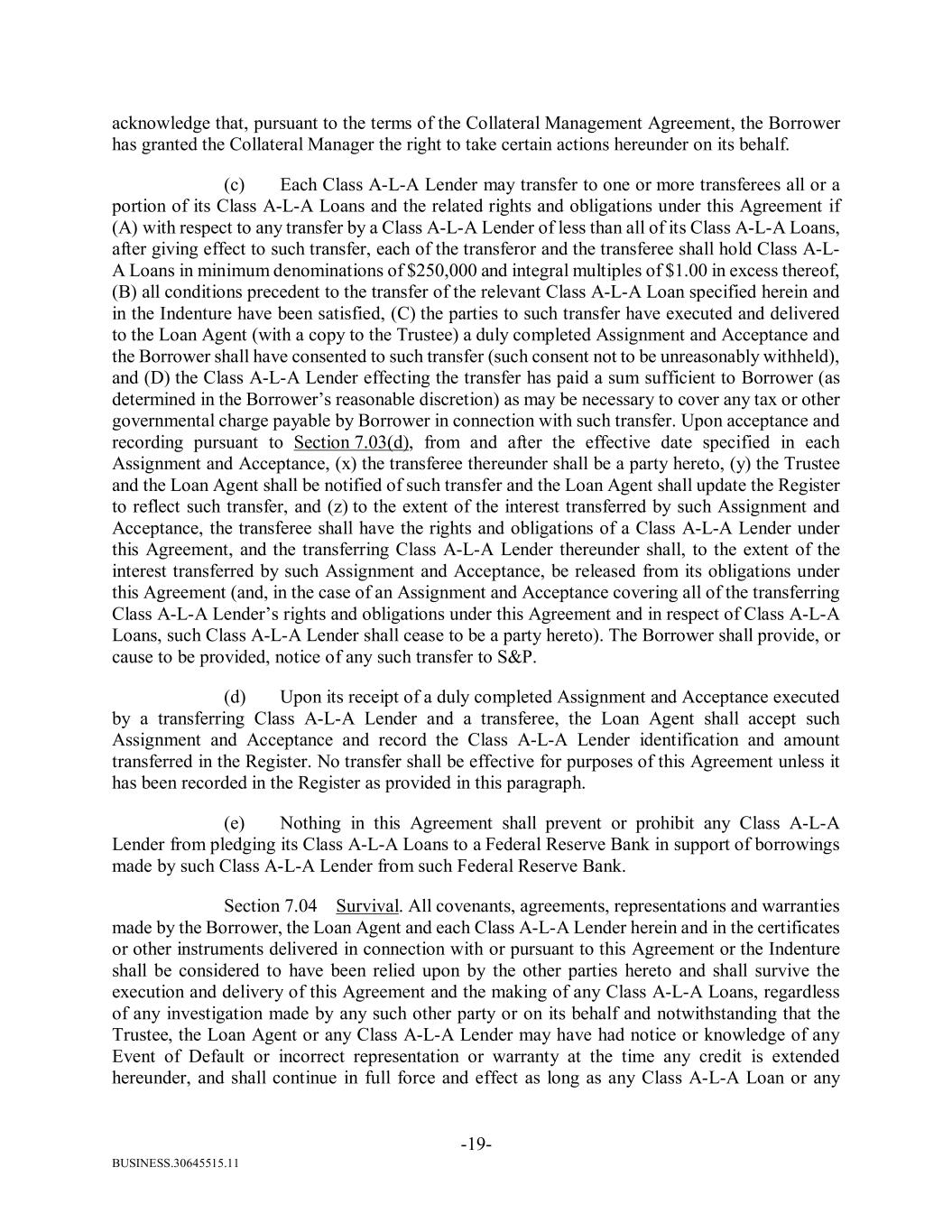 BUSINESS.30645515.11 -19- acknowledge that, pursuant to the terms of the Collateral Management Agreement, the Borrower has granted the Collateral Manager the right to take certain actions hereunder on its behalf. (c) Each Class A-L-A Lender may transfer to one or more transferees all or a portion of its Class A-L-A Loans and the related rights and obligations under this Agreement if (A) with respect to any transfer by a Class A-L-A Lender of less than all of its Class A-L-A Loans, after giving effect to such transfer, each of the transferor and the transferee shall hold Class A-L- A Loans in minimum denominations of $250,000 and integral multiples of $1.00 in excess thereof, (B) all conditions precedent to the transfer of the relevant Class A-L-A Loan specified herein and in the Indenture have been satisfied, (C) the parties to such transfer have executed and delivered to the Loan Agent (with a copy to the Trustee) a duly completed Assignment and Acceptance and the Borrower shall have consented to such transfer (such consent not to be unreasonably withheld), and (D) the Class A-L-A Lender effecting the transfer has paid a sum sufficient to Borrower (as determined in the Borrower’s reasonable discretion) as may be necessary to cover any tax or other governmental charge payable by Borrower in connection with such transfer. Upon acceptance and recording pursuant to Section 7.03(d), from and after the effective date specified in each Assignment and Acceptance, (x) the transferee thereunder shall be a party hereto, (y) the Trustee and the Loan Agent shall be notified of such transfer and the Loan Agent shall update the Register to reflect such transfer, and (z) to the extent of the interest transferred by such Assignment and Acceptance, the transferee shall have the rights and obligations of a Class A-L-A Lender under this Agreement, and the transferring Class A-L-A Lender thereunder shall, to the extent of the interest transferred by such Assignment and Acceptance, be released from its obligations under this Agreement (and, in the case of an Assignment and Acceptance covering all of the transferring Class A-L-A Lender’s rights and obligations under this Agreement and in respect of Class A-L-A Loans, such Class A-L-A Lender shall cease to be a party hereto). The Borrower shall provide, or cause to be provided, notice of any such transfer to S&P. (d) Upon its receipt of a duly completed Assignment and Acceptance executed by a transferring Class A-L-A Lender and a transferee, the Loan Agent shall accept such Assignment and Acceptance and record the Class A-L-A Lender identification and amount transferred in the Register. No transfer shall be effective for purposes of this Agreement unless it has been recorded in the Register as provided in this paragraph. (e) Nothing in this Agreement shall prevent or prohibit any Class A-L-A Lender from pledging its Class A-L-A Loans to a Federal Reserve Bank in support of borrowings made by such Class A-L-A Lender from such Federal Reserve Bank. Section 7.04 Survival. All covenants, agreements, representations and warranties made by the Borrower, the Loan Agent and each Class A-L-A Lender herein and in the certificates or other instruments delivered in connection with or pursuant to this Agreement or the Indenture shall be considered to have been relied upon by the other parties hereto and shall survive the execution and delivery of this Agreement and the making of any Class A-L-A Loans, regardless of any investigation made by any such other party or on its behalf and notwithstanding that the Trustee, the Loan Agent or any Class A-L-A Lender may have had notice or knowledge of any Event of Default or incorrect representation or warranty at the time any credit is extended hereunder, and shall continue in full force and effect as long as any Class A-L-A Loan or any