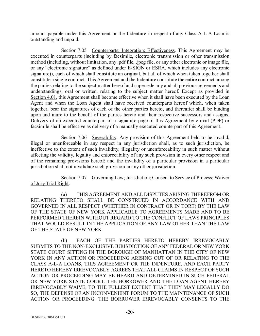 BUSINESS.30645515.11 -20- amount payable under this Agreement or the Indenture in respect of any Class A-L-A Loan is outstanding and unpaid. Section 7.05 Counterparts; Integration; Effectiveness. This Agreement may be executed in counterparts (including by facsimile, electronic transmission or other transmission method (including, without limitation, any .pdf file, .jpeg file, or any other electronic or image file, or any “electronic signature” as defined under E-SIGN or ESRA, which includes any electronic signature)), each of which shall constitute an original, but all of which when taken together shall constitute a single contract. This Agreement and the Indenture constitute the entire contract among the parties relating to the subject matter hereof and supersede any and all previous agreements and understandings, oral or written, relating to the subject matter hereof. Except as provided in Section 4.01, this Agreement shall become effective when it shall have been executed by the Loan Agent and when the Loan Agent shall have received counterparts hereof which, when taken together, bear the signatures of each of the other parties hereto, and thereafter shall be binding upon and inure to the benefit of the parties hereto and their respective successors and assigns. Delivery of an executed counterpart of a signature page of this Agreement by e-mail (PDF) or facsimile shall be effective as delivery of a manually executed counterpart of this Agreement. Section 7.06 Severability. Any provision of this Agreement held to be invalid, illegal or unenforceable in any respect in any jurisdiction shall, as to such jurisdiction, be ineffective to the extent of such invalidity, illegality or unenforceability in such matter without affecting the validity, legality and enforceability of any such provision in every other respect and of the remaining provisions hereof; and the invalidity of a particular provision in a particular jurisdiction shall not invalidate such provision in any other jurisdiction. Section 7.07 Governing Law; Jurisdiction; Consent to Service of Process; Waiver of Jury Trial Right. (a) THIS AGREEMENT AND ALL DISPUTES ARISING THEREFROM OR RELATING THERETO SHALL BE CONSTRUED IN ACCORDANCE WITH AND GOVERNED IN ALL RESPECT (WHETHER IN CONTRACT OR IN TORT) BY THE LAW OF THE STATE OF NEW YORK APPLICABLE TO AGREEMENTS MADE AND TO BE PERFORMED THEREIN WITHOUT REGARD TO THE CONFLICT OF LAWS PRINCIPLES THAT WOULD RESULT IN THE APPLICATION OF ANY LAW OTHER THAN THE LAW OF THE STATE OF NEW YORK. (b) EACH OF THE PARTIES HERETO HEREBY IRREVOCABLY SUBMITS TO THE NON-EXCLUSIVE JURISDICTION OF ANY FEDERAL OR NEW YORK STATE COURT SITTING IN THE BOROUGH OF MANHATTAN IN THE CITY OF NEW YORK IN ANY ACTION OR PROCEEDING ARISING OUT OF OR RELATING TO THE CLASS A-L-A LOANS, THIS AGREEMENT OR THE INDENTURE, AND EACH PARTY HERETO HEREBY IRREVOCABLY AGREES THAT ALL CLAIMS IN RESPECT OF SUCH ACTION OR PROCEEDING MAY BE HEARD AND DETERMINED IN SUCH FEDERAL OR NEW YORK STATE COURT. THE BORROWER AND THE LOAN AGENT HEREBY IRREVOCABLY WAIVE, TO THE FULLEST EXTENT THAT THEY MAY LEGALLY DO SO, THE DEFENSE OF AN INCONVENIENT FORUM TO THE MAINTENANCE OF SUCH ACTION OR PROCEEDING. THE BORROWER IRREVOCABLY CONSENTS TO THE