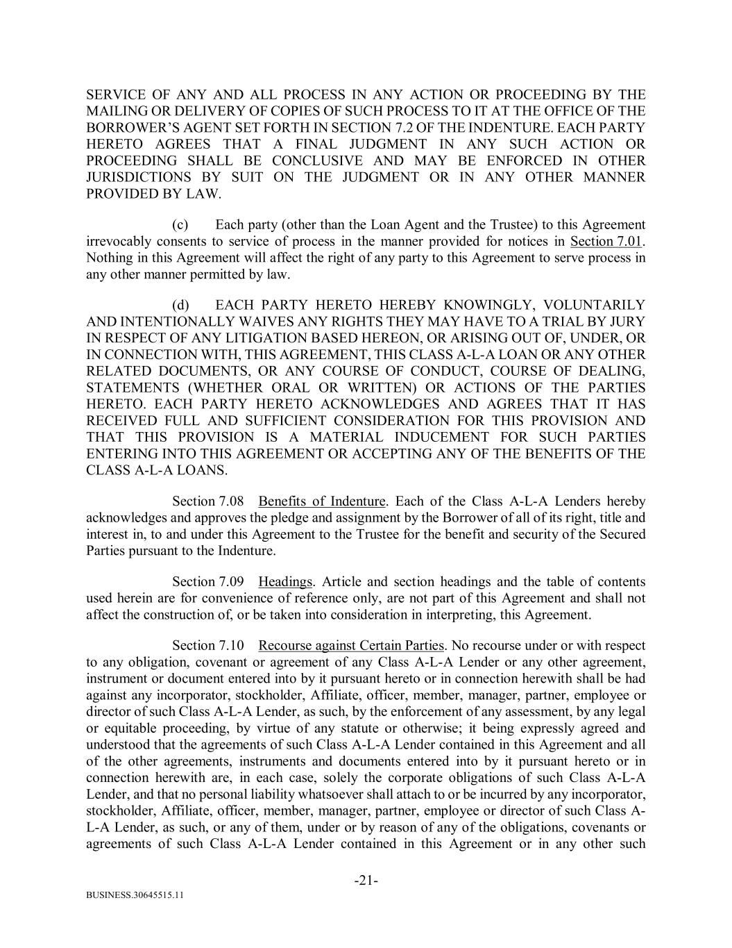 BUSINESS.30645515.11 -21- SERVICE OF ANY AND ALL PROCESS IN ANY ACTION OR PROCEEDING BY THE MAILING OR DELIVERY OF COPIES OF SUCH PROCESS TO IT AT THE OFFICE OF THE BORROWER’S AGENT SET FORTH IN SECTION 7.2 OF THE INDENTURE. EACH PARTY HERETO AGREES THAT A FINAL JUDGMENT IN ANY SUCH ACTION OR PROCEEDING SHALL BE CONCLUSIVE AND MAY BE ENFORCED IN OTHER JURISDICTIONS BY SUIT ON THE JUDGMENT OR IN ANY OTHER MANNER PROVIDED BY LAW. (c) Each party (other than the Loan Agent and the Trustee) to this Agreement irrevocably consents to service of process in the manner provided for notices in Section 7.01. Nothing in this Agreement will affect the right of any party to this Agreement to serve process in any other manner permitted by law. (d) EACH PARTY HERETO HEREBY KNOWINGLY, VOLUNTARILY AND INTENTIONALLY WAIVES ANY RIGHTS THEY MAY HAVE TO A TRIAL BY JURY IN RESPECT OF ANY LITIGATION BASED HEREON, OR ARISING OUT OF, UNDER, OR IN CONNECTION WITH, THIS AGREEMENT, THIS CLASS A-L-A LOAN OR ANY OTHER RELATED DOCUMENTS, OR ANY COURSE OF CONDUCT, COURSE OF DEALING, STATEMENTS (WHETHER ORAL OR WRITTEN) OR ACTIONS OF THE PARTIES HERETO. EACH PARTY HERETO ACKNOWLEDGES AND AGREES THAT IT HAS RECEIVED FULL AND SUFFICIENT CONSIDERATION FOR THIS PROVISION AND THAT THIS PROVISION IS A MATERIAL INDUCEMENT FOR SUCH PARTIES ENTERING INTO THIS AGREEMENT OR ACCEPTING ANY OF THE BENEFITS OF THE CLASS A-L-A LOANS. Section 7.08 Benefits of Indenture. Each of the Class A-L-A Lenders hereby acknowledges and approves the pledge and assignment by the Borrower of all of its right, title and interest in, to and under this Agreement to the Trustee for the benefit and security of the Secured Parties pursuant to the Indenture. Section 7.09 Headings. Article and section headings and the table of contents used herein are for convenience of reference only, are not part of this Agreement and shall not affect the construction of, or be taken into consideration in interpreting, this Agreement. Section 7.10 Recourse against Certain Parties. No recourse under or with respect to any obligation, covenant or agreement of any Class A-L-A Lender or any other agreement, instrument or document entered into by it pursuant hereto or in connection herewith shall be had against any incorporator, stockholder, Affiliate, officer, member, manager, partner, employee or director of such Class A-L-A Lender, as such, by the enforcement of any assessment, by any legal or equitable proceeding, by virtue of any statute or otherwise; it being expressly agreed and understood that the agreements of such Class A-L-A Lender contained in this Agreement and all of the other agreements, instruments and documents entered into by it pursuant hereto or in connection herewith are, in each case, solely the corporate obligations of such Class A-L-A Lender, and that no personal liability whatsoever shall attach to or be incurred by any incorporator, stockholder, Affiliate, officer, member, manager, partner, employee or director of such Class A- L-A Lender, as such, or any of them, under or by reason of any of the obligations, covenants or agreements of such Class A-L-A Lender contained in this Agreement or in any other such