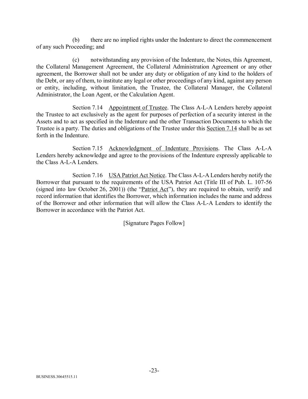 BUSINESS.30645515.11 -23- (b) there are no implied rights under the Indenture to direct the commencement of any such Proceeding; and (c) notwithstanding any provision of the Indenture, the Notes, this Agreement, the Collateral Management Agreement, the Collateral Administration Agreement or any other agreement, the Borrower shall not be under any duty or obligation of any kind to the holders of the Debt, or any of them, to institute any legal or other proceedings of any kind, against any person or entity, including, without limitation, the Trustee, the Collateral Manager, the Collateral Administrator, the Loan Agent, or the Calculation Agent. Section 7.14 Appointment of Trustee. The Class A-L-A Lenders hereby appoint the Trustee to act exclusively as the agent for purposes of perfection of a security interest in the Assets and to act as specified in the Indenture and the other Transaction Documents to which the Trustee is a party. The duties and obligations of the Trustee under this Section 7.14 shall be as set forth in the Indenture. Section 7.15 Acknowledgment of Indenture Provisions. The Class A-L-A Lenders hereby acknowledge and agree to the provisions of the Indenture expressly applicable to the Class A-L-A Lenders. Section 7.16 USA Patriot Act Notice. The Class A-L-A Lenders hereby notify the Borrower that pursuant to the requirements of the USA Patriot Act (Title III of Pub. L. 107-56 (signed into law October 26, 2001)) (the “Patriot Act”), they are required to obtain, verify and record information that identifies the Borrower, which information includes the name and address of the Borrower and other information that will allow the Class A-L-A Lenders to identify the Borrower in accordance with the Patriot Act. [Signature Pages Follow]