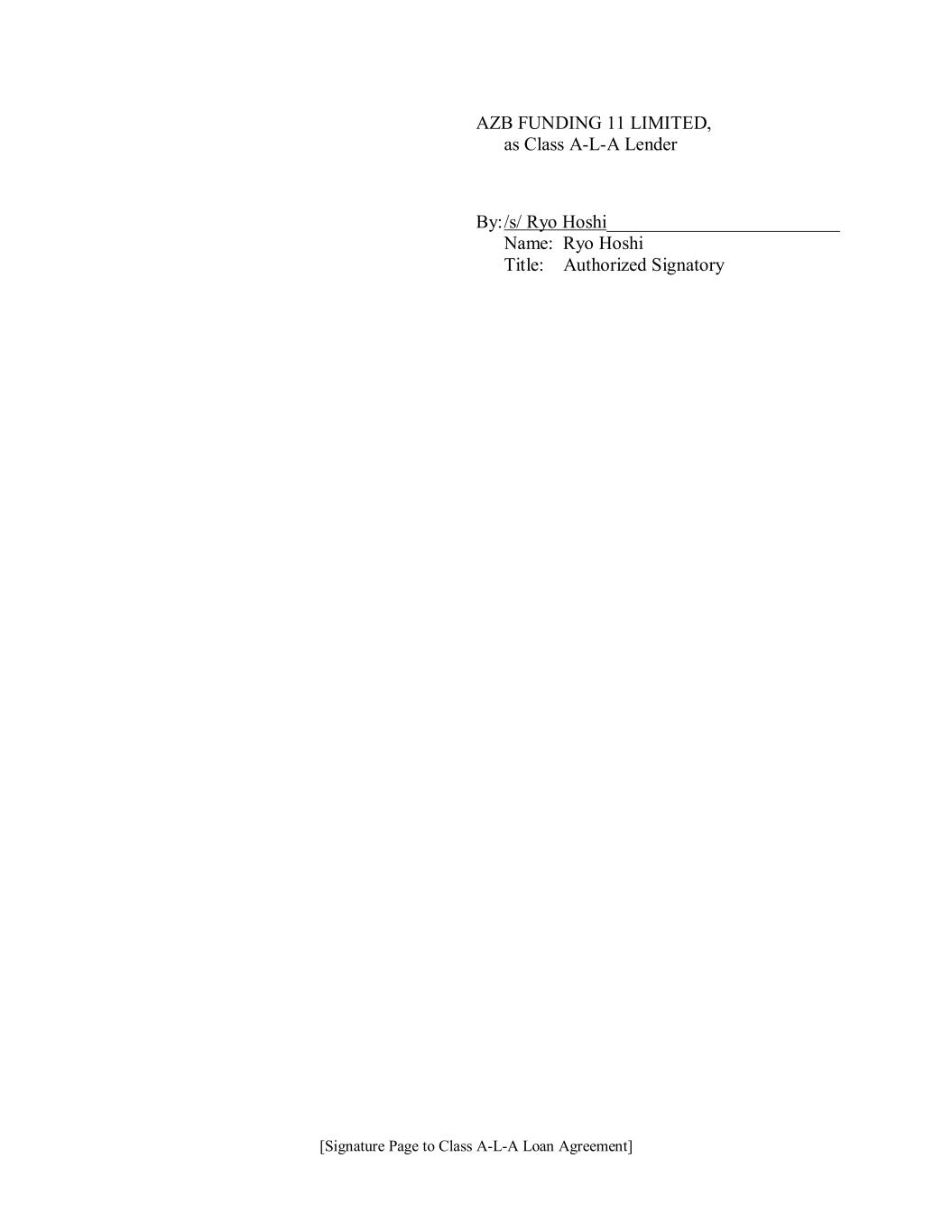 [Signature Page to Class A-L-A Loan Agreement] AZB FUNDING 11 LIMITED, as Class A-L-A Lender By: /s/ Ryo Hoshi_________________________ Name: Ryo Hoshi Title: Authorized Signatory