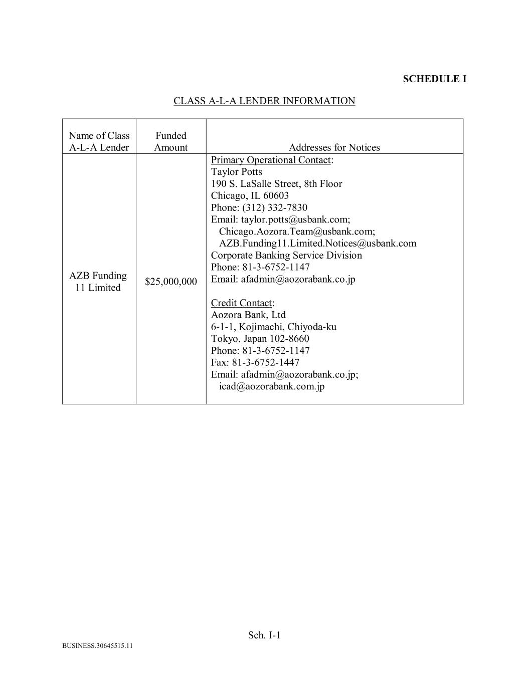 BUSINESS.30645515.11 Sch. I-1 SCHEDULE I CLASS A-L-A LENDER INFORMATION Name of Class A-L-A Lender Funded Amount Addresses for Notices AZB Funding 11 Limited $25,000,000 Primary Operational Contact: Taylor Potts 190 S. LaSalle Street, 8th Floor Chicago, IL 60603 Phone: (312) 332-7830 Email: taylor.potts@usbank.com; Chicago.Aozora.Team@usbank.com; AZB.Funding11.Limited.Notices@usbank.com Corporate Banking Service Division Phone: 81-3-6752-1147 Email: afadmin@aozorabank.co.jp Credit Contact: Aozora Bank, Ltd 6-1-1, Kojimachi, Chiyoda-ku Tokyo, Japan 102-8660 Phone: 81-3-6752-1147 Fax: 81-3-6752-1447 Email: afadmin@aozorabank.co.jp; icad@aozorabank.com.jp