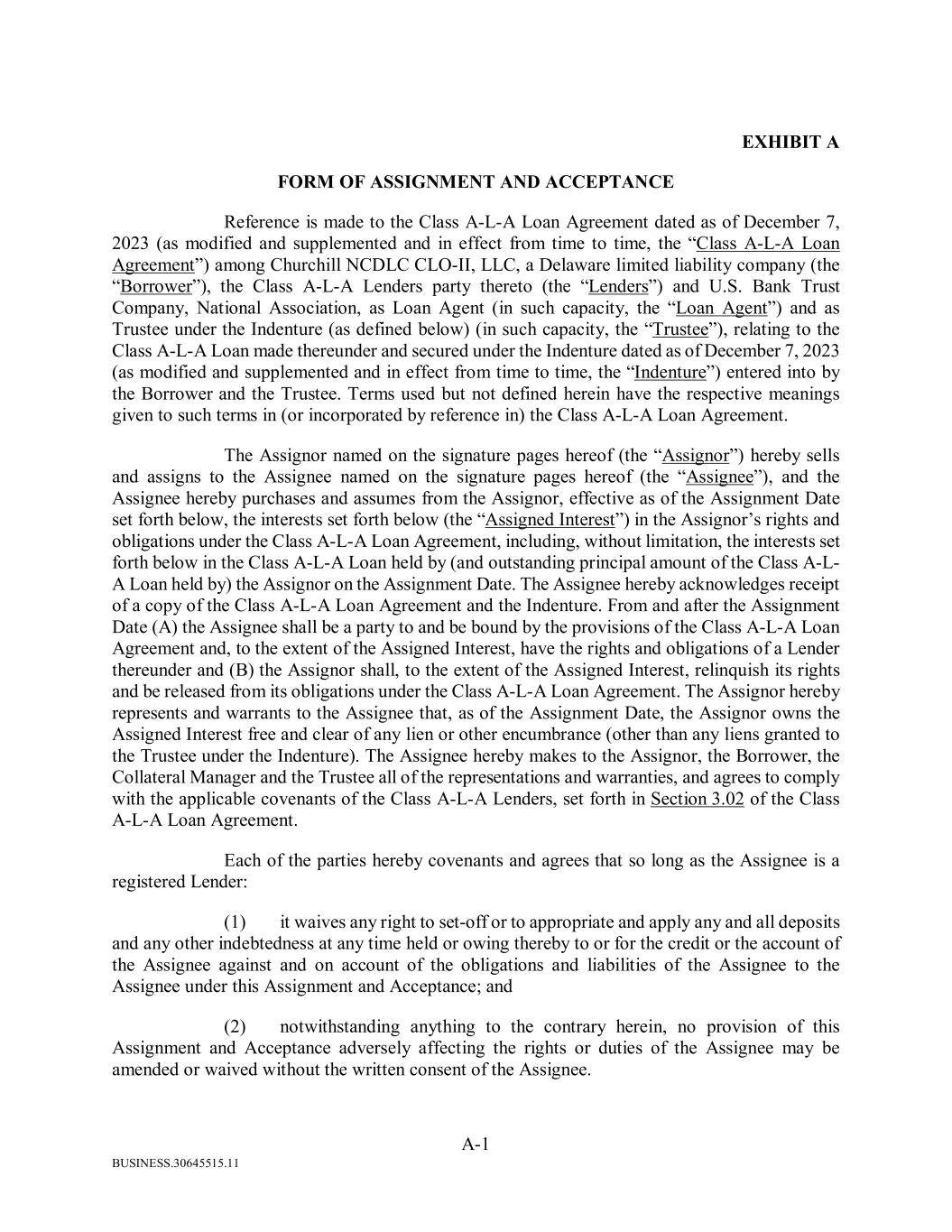 BUSINESS.30645515.11 A-1 EXHIBIT A FORM OF ASSIGNMENT AND ACCEPTANCE Reference is made to the Class A-L-A Loan Agreement dated as of December 7, 2023 (as modified and supplemented and in effect from time to time, the “Class A-L-A Loan Agreement”) among Churchill NCDLC CLO-II, LLC, a Delaware limited liability company (the “Borrower”), the Class A-L-A Lenders party thereto (the “Lenders”) and U.S. Bank Trust Company, National Association, as Loan Agent (in such capacity, the “Loan Agent”) and as Trustee under the Indenture (as defined below) (in such capacity, the “Trustee”), relating to the Class A-L-A Loan made thereunder and secured under the Indenture dated as of December 7, 2023 (as modified and supplemented and in effect from time to time, the “Indenture”) entered into by the Borrower and the Trustee. Terms used but not defined herein have the respective meanings given to such terms in (or incorporated by reference in) the Class A-L-A Loan Agreement. The Assignor named on the signature pages hereof (the “Assignor”) hereby sells and assigns to the Assignee named on the signature pages hereof (the “Assignee”), and the Assignee hereby purchases and assumes from the Assignor, effective as of the Assignment Date set forth below, the interests set forth below (the “Assigned Interest”) in the Assignor’s rights and obligations under the Class A-L-A Loan Agreement, including, without limitation, the interests set forth below in the Class A-L-A Loan held by (and outstanding principal amount of the Class A-L- A Loan held by) the Assignor on the Assignment Date. The Assignee hereby acknowledges receipt of a copy of the Class A-L-A Loan Agreement and the Indenture. From and after the Assignment Date (A) the Assignee shall be a party to and be bound by the provisions of the Class A-L-A Loan Agreement and, to the extent of the Assigned Interest, have the rights and obligations of a Lender thereunder and (B) the Assignor shall, to the extent of the Assigned Interest, relinquish its rights and be released from its obligations under the Class A-L-A Loan Agreement. The Assignor hereby represents and warrants to the Assignee that, as of the Assignment Date, the Assignor owns the Assigned Interest free and clear of any lien or other encumbrance (other than any liens granted to the Trustee under the Indenture). The Assignee hereby makes to the Assignor, the Borrower, the Collateral Manager and the Trustee all of the representations and warranties, and agrees to comply with the applicable covenants of the Class A-L-A Lenders, set forth in Section 3.02 of the Class A-L-A Loan Agreement. Each of the parties hereby covenants and agrees that so long as the Assignee is a registered Lender: (1) it waives any right to set-off or to appropriate and apply any and all deposits and any other indebtedness at any time held or owing thereby to or for the credit or the account of the Assignee against and on account of the obligations and liabilities of the Assignee to the Assignee under this Assignment and Acceptance; and (2) notwithstanding anything to the contrary herein, no provision of this Assignment and Acceptance adversely affecting the rights or duties of the Assignee may be amended or waived without the written consent of the Assignee.