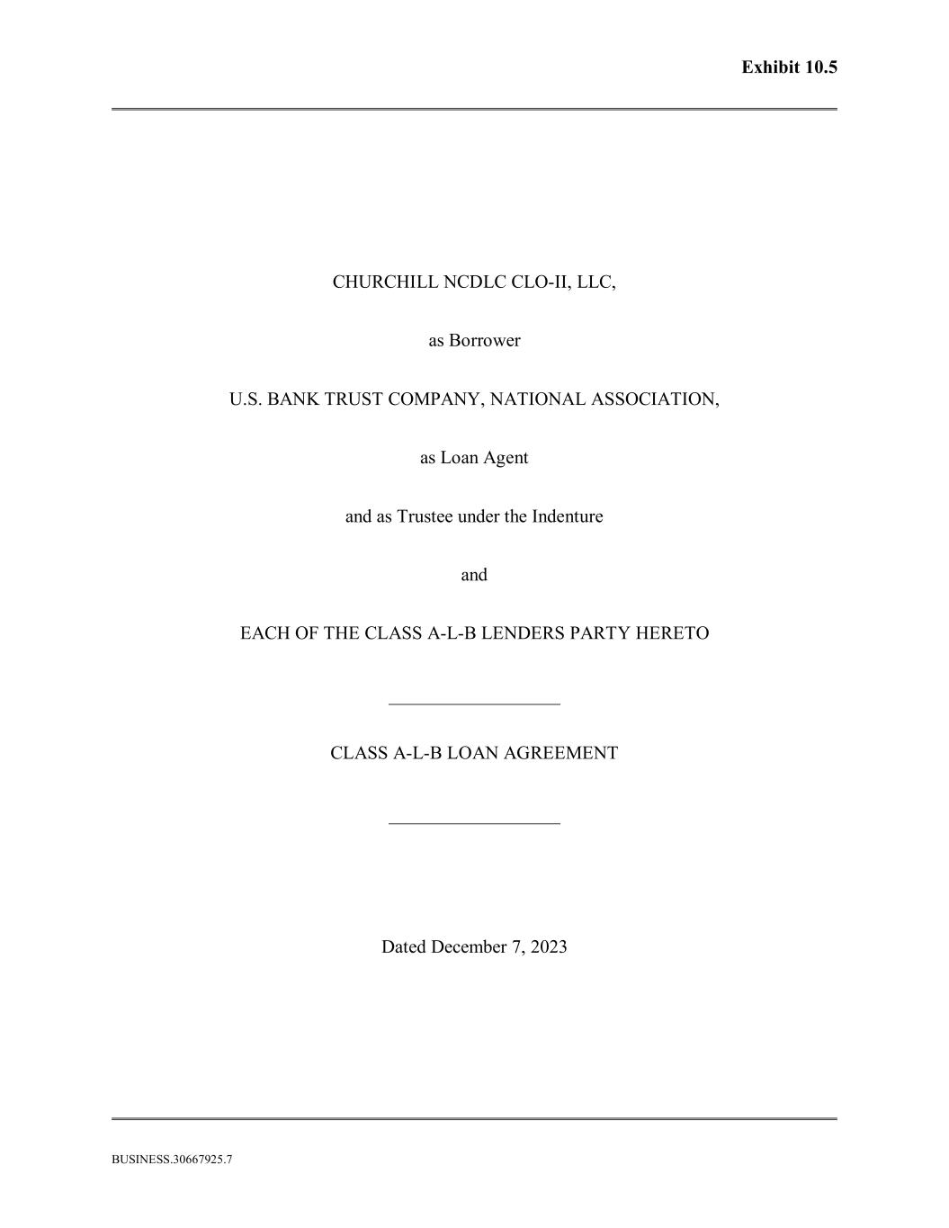 BUSINESS.30667925.7 Exhibit 10.5 CHURCHILL NCDLC CLO-II, LLC, as Borrower U.S. BANK TRUST COMPANY, NATIONAL ASSOCIATION, as Loan Agent and as Trustee under the Indenture and EACH OF THE CLASS A-L-B LENDERS PARTY HERETO CLASS A-L-B LOAN AGREEMENT Dated December 7, 2023