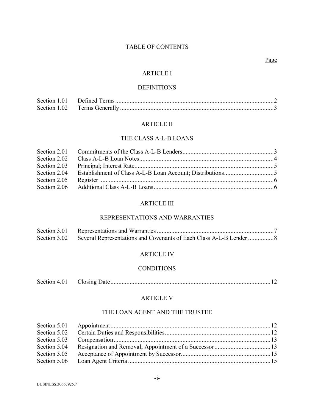 BUSINESS.30667925.7 -i- TABLE OF CONTENTS Page ARTICLE I DEFINITIONS Section 1.01 Defined Terms ................................................................................................... 2 Section 1.02 Terms Generally ................................................................................................ 3 ARTICLE II THE CLASS A-L-B LOANS Section 2.01 Commitments of the Class A-L-B Lenders ......................................................... 3 Section 2.02 Class A-L-B Loan Notes .................................................................................... 4 Section 2.03 Principal; Interest Rate ....................................................................................... 5 Section 2.04 Establishment of Class A-L-B Loan Account; Distributions ............................... 5 Section 2.05 Register ............................................................................................................. 6 Section 2.06 Additional Class A-L-B Loans ........................................................................... 6 ARTICLE III REPRESENTATIONS AND WARRANTIES Section 3.01 Representations and Warranties ......................................................................... 7 Section 3.02 Several Representations and Covenants of Each Class A-L-B Lender ................ 8 ARTICLE IV CONDITIONS Section 4.01 Closing Date .................................................................................................... 12 ARTICLE V THE LOAN AGENT AND THE TRUSTEE Section 5.01 Appointment .................................................................................................... 12 Section 5.02 Certain Duties and Responsibilities .................................................................. 12 Section 5.03 Compensation .................................................................................................. 13 Section 5.04 Resignation and Removal; Appointment of a Successor ................................... 13 Section 5.05 Acceptance of Appointment by Successor ........................................................ 15 Section 5.06 Loan Agent Criteria ......................................................................................... 15