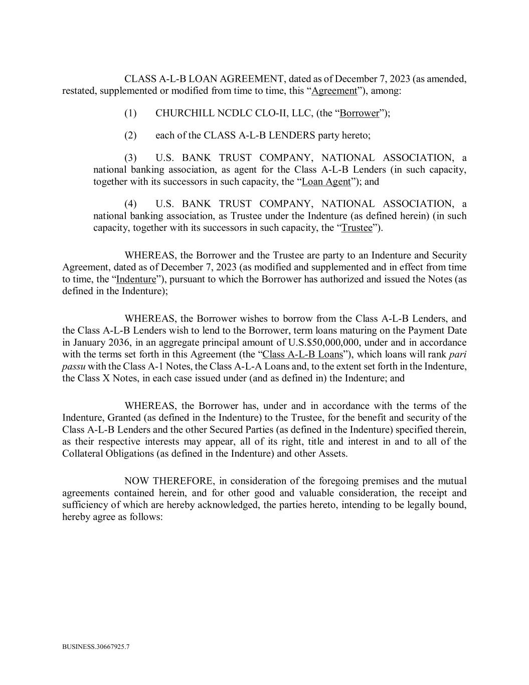 BUSINESS.30667925.7 CLASS A-L-B LOAN AGREEMENT, dated as of December 7, 2023 (as amended, restated, supplemented or modified from time to time, this “Agreement”), among: (1) CHURCHILL NCDLC CLO-II, LLC, (the “Borrower”); (2) each of the CLASS A-L-B LENDERS party hereto; (3) U.S. BANK TRUST COMPANY, NATIONAL ASSOCIATION, a national banking association, as agent for the Class A-L-B Lenders (in such capacity, together with its successors in such capacity, the “Loan Agent”); and (4) U.S. BANK TRUST COMPANY, NATIONAL ASSOCIATION, a national banking association, as Trustee under the Indenture (as defined herein) (in such capacity, together with its successors in such capacity, the “Trustee”). WHEREAS, the Borrower and the Trustee are party to an Indenture and Security Agreement, dated as of December 7, 2023 (as modified and supplemented and in effect from time to time, the “Indenture”), pursuant to which the Borrower has authorized and issued the Notes (as defined in the Indenture); WHEREAS, the Borrower wishes to borrow from the Class A-L-B Lenders, and the Class A-L-B Lenders wish to lend to the Borrower, term loans maturing on the Payment Date in January 2036, in an aggregate principal amount of U.S.$50,000,000, under and in accordance with the terms set forth in this Agreement (the “Class A-L-B Loans”), which loans will rank pari passu with the Class A-1 Notes, the Class A-L-A Loans and, to the extent set forth in the Indenture, the Class X Notes, in each case issued under (and as defined in) the Indenture; and WHEREAS, the Borrower has, under and in accordance with the terms of the Indenture, Granted (as defined in the Indenture) to the Trustee, for the benefit and security of the Class A-L-B Lenders and the other Secured Parties (as defined in the Indenture) specified therein, as their respective interests may appear, all of its right, title and interest in and to all of the Collateral Obligations (as defined in the Indenture) and other Assets. NOW THEREFORE, in consideration of the foregoing premises and the mutual agreements contained herein, and for other good and valuable consideration, the receipt and sufficiency of which are hereby acknowledged, the parties hereto, intending to be legally bound, hereby agree as follows: