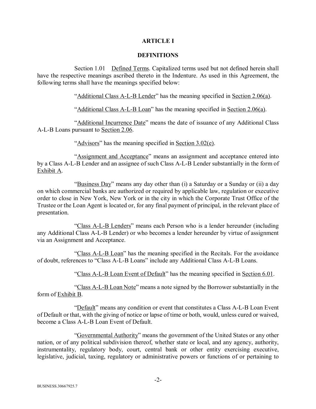 BUSINESS.30667925.7 -2- ARTICLE I DEFINITIONS Section 1.01 Defined Terms. Capitalized terms used but not defined herein shall have the respective meanings ascribed thereto in the Indenture. As used in this Agreement, the following terms shall have the meanings specified below: “Additional Class A-L-B Lender” has the meaning specified in Section 2.06(a). “Additional Class A-L-B Loan” has the meaning specified in Section 2.06(a). “Additional Incurrence Date” means the date of issuance of any Additional Class A-L-B Loans pursuant to Section 2.06. “Advisors” has the meaning specified in Section 3.02(e). “Assignment and Acceptance” means an assignment and acceptance entered into by a Class A-L-B Lender and an assignee of such Class A-L-B Lender substantially in the form of Exhibit A. “Business Day” means any day other than (i) a Saturday or a Sunday or (ii) a day on which commercial banks are authorized or required by applicable law, regulation or executive order to close in New York, New York or in the city in which the Corporate Trust Office of the Trustee or the Loan Agent is located or, for any final payment of principal, in the relevant place of presentation. “Class A-L-B Lenders” means each Person who is a lender hereunder (including any Additional Class A-L-B Lender) or who becomes a lender hereunder by virtue of assignment via an Assignment and Acceptance. “Class A-L-B Loan” has the meaning specified in the Recitals. For the avoidance of doubt, references to “Class A-L-B Loans” include any Additional Class A-L-B Loans. “Class A-L-B Loan Event of Default” has the meaning specified in Section 6.01. “Class A-L-B Loan Note” means a note signed by the Borrower substantially in the form of Exhibit B. “Default” means any condition or event that constitutes a Class A-L-B Loan Event of Default or that, with the giving of notice or lapse of time or both, would, unless cured or waived, become a Class A-L-B Loan Event of Default. “Governmental Authority” means the government of the United States or any other nation, or of any political subdivision thereof, whether state or local, and any agency, authority, instrumentality, regulatory body, court, central bank or other entity exercising executive, legislative, judicial, taxing, regulatory or administrative powers or functions of or pertaining to