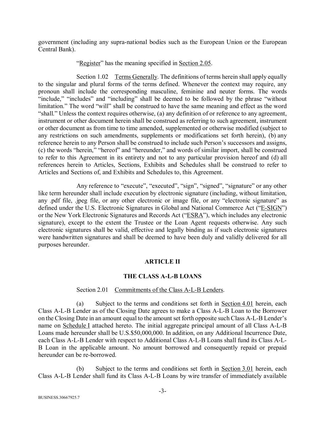 BUSINESS.30667925.7 -3- government (including any supra-national bodies such as the European Union or the European Central Bank). “Register” has the meaning specified in Section 2.05. Section 1.02 Terms Generally. The definitions of terms herein shall apply equally to the singular and plural forms of the terms defined. Whenever the context may require, any pronoun shall include the corresponding masculine, feminine and neuter forms. The words “include,” “includes” and “including” shall be deemed to be followed by the phrase “without limitation.” The word “will” shall be construed to have the same meaning and effect as the word “shall.” Unless the context requires otherwise, (a) any definition of or reference to any agreement, instrument or other document herein shall be construed as referring to such agreement, instrument or other document as from time to time amended, supplemented or otherwise modified (subject to any restrictions on such amendments, supplements or modifications set forth herein), (b) any reference herein to any Person shall be construed to include such Person’s successors and assigns, (c) the words “herein,” “hereof” and “hereunder,” and words of similar import, shall be construed to refer to this Agreement in its entirety and not to any particular provision hereof and (d) all references herein to Articles, Sections, Exhibits and Schedules shall be construed to refer to Articles and Sections of, and Exhibits and Schedules to, this Agreement. Any reference to “execute”, “executed”, “sign”, “signed”, “signature” or any other like term hereunder shall include execution by electronic signature (including, without limitation, any .pdf file, .jpeg file, or any other electronic or image file, or any “electronic signature” as defined under the U.S. Electronic Signatures in Global and National Commerce Act (“E-SIGN”) or the New York Electronic Signatures and Records Act (“ESRA”), which includes any electronic signature), except to the extent the Trustee or the Loan Agent requests otherwise. Any such electronic signatures shall be valid, effective and legally binding as if such electronic signatures were handwritten signatures and shall be deemed to have been duly and validly delivered for all purposes hereunder. ARTICLE II THE CLASS A-L-B LOANS Section 2.01 Commitments of the Class A-L-B Lenders. (a) Subject to the terms and conditions set forth in Section 4.01 herein, each Class A-L-B Lender as of the Closing Date agrees to make a Class A-L-B Loan to the Borrower on the Closing Date in an amount equal to the amount set forth opposite such Class A-L-B Lender’s name on Schedule I attached hereto. The initial aggregate principal amount of all Class A-L-B Loans made hereunder shall be U.S.$50,000,000. In addition, on any Additional Incurrence Date, each Class A-L-B Lender with respect to Additional Class A-L-B Loans shall fund its Class A-L- B Loan in the applicable amount. No amount borrowed and consequently repaid or prepaid hereunder can be re-borrowed. (b) Subject to the terms and conditions set forth in Section 3.01 herein, each Class A-L-B Lender shall fund its Class A-L-B Loans by wire transfer of immediately available