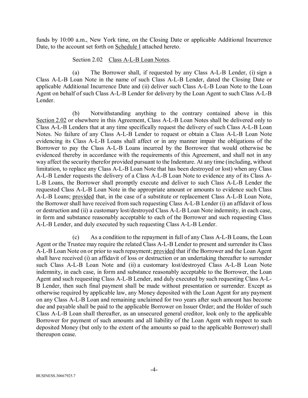 BUSINESS.30667925.7 -4- funds by 10:00 a.m., New York time, on the Closing Date or applicable Additional Incurrence Date, to the account set forth on Schedule I attached hereto. Section 2.02 Class A-L-B Loan Notes. (a) The Borrower shall, if requested by any Class A-L-B Lender, (i) sign a Class A-L-B Loan Note in the name of such Class A-L-B Lender, dated the Closing Date or applicable Additional Incurrence Date and (ii) deliver such Class A-L-B Loan Note to the Loan Agent on behalf of such Class A-L-B Lender for delivery by the Loan Agent to such Class A-L-B Lender. (b) Notwithstanding anything to the contrary contained above in this Section 2.02 or elsewhere in this Agreement, Class A-L-B Loan Notes shall be delivered only to Class A-L-B Lenders that at any time specifically request the delivery of such Class A-L-B Loan Notes. No failure of any Class A-L-B Lender to request or obtain a Class A-L-B Loan Note evidencing its Class A-L-B Loans shall affect or in any manner impair the obligations of the Borrower to pay the Class A-L-B Loans incurred by the Borrower that would otherwise be evidenced thereby in accordance with the requirements of this Agreement, and shall not in any way affect the security therefor provided pursuant to the Indenture. At any time (including, without limitation, to replace any Class A-L-B Loan Note that has been destroyed or lost) when any Class A-L-B Lender requests the delivery of a Class A-L-B Loan Note to evidence any of its Class A- L-B Loans, the Borrower shall promptly execute and deliver to such Class A-L-B Lender the requested Class A-L-B Loan Note in the appropriate amount or amounts to evidence such Class A-L-B Loans; provided that, in the case of a substitute or replacement Class A-L-B Loan Note, the Borrower shall have received from such requesting Class A-L-B Lender (i) an affidavit of loss or destruction and (ii) a customary lost/destroyed Class A-L-B Loan Note indemnity, in each case, in form and substance reasonably acceptable to each of the Borrower and such requesting Class A-L-B Lender, and duly executed by such requesting Class A-L-B Lender. (c) As a condition to the repayment in full of any Class A-L-B Loans, the Loan Agent or the Trustee may require the related Class A-L-B Lender to present and surrender its Class A-L-B Loan Note on or prior to such repayment; provided that if the Borrower and the Loan Agent shall have received (i) an affidavit of loss or destruction or an undertaking thereafter to surrender such Class A-L-B Loan Note and (ii) a customary lost/destroyed Class A-L-B Loan Note indemnity, in each case, in form and substance reasonably acceptable to the Borrower, the Loan Agent and such requesting Class A-L-B Lender, and duly executed by such requesting Class A-L- B Lender, then such final payment shall be made without presentation or surrender. Except as otherwise required by applicable law, any Money deposited with the Loan Agent for any payment on any Class A-L-B Loan and remaining unclaimed for two years after such amount has become due and payable shall be paid to the applicable Borrower on Issuer Order; and the Holder of such Class A-L-B Loan shall thereafter, as an unsecured general creditor, look only to the applicable Borrower for payment of such amounts and all liability of the Loan Agent with respect to such deposited Money (but only to the extent of the amounts so paid to the applicable Borrower) shall thereupon cease.