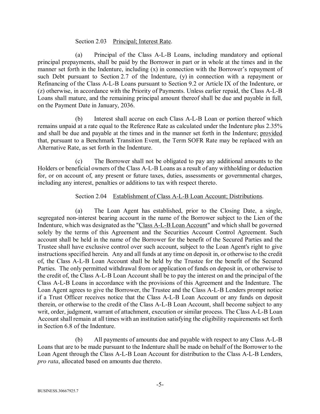BUSINESS.30667925.7 -5- Section 2.03 Principal; Interest Rate. (a) Principal of the Class A-L-B Loans, including mandatory and optional principal prepayments, shall be paid by the Borrower in part or in whole at the times and in the manner set forth in the Indenture, including (x) in connection with the Borrower’s repayment of such Debt pursuant to Section 2.7 of the Indenture, (y) in connection with a repayment or Refinancing of the Class A-L-B Loans pursuant to Section 9.2 or Article IX of the Indenture, or (z) otherwise, in accordance with the Priority of Payments. Unless earlier repaid, the Class A-L-B Loans shall mature, and the remaining principal amount thereof shall be due and payable in full, on the Payment Date in January, 2036. (b) Interest shall accrue on each Class A-L-B Loan or portion thereof which remains unpaid at a rate equal to the Reference Rate as calculated under the Indenture plus 2.35% and shall be due and payable at the times and in the manner set forth in the Indenture; provided that, pursuant to a Benchmark Transition Event, the Term SOFR Rate may be replaced with an Alternative Rate, as set forth in the Indenture. (c) The Borrower shall not be obligated to pay any additional amounts to the Holders or beneficial owners of the Class A-L-B Loans as a result of any withholding or deduction for, or on account of, any present or future taxes, duties, assessments or governmental charges, including any interest, penalties or additions to tax with respect thereto. Section 2.04 Establishment of Class A-L-B Loan Account; Distributions. (a) The Loan Agent has established, prior to the Closing Date, a single, segregated non-interest bearing account in the name of the Borrower subject to the Lien of the Indenture, which was designated as the "Class A-L-B Loan Account" and which shall be governed solely by the terms of this Agreement and the Securities Account Control Agreement. Such account shall be held in the name of the Borrower for the benefit of the Secured Parties and the Trustee shall have exclusive control over such account, subject to the Loan Agent's right to give instructions specified herein. Any and all funds at any time on deposit in, or otherwise to the credit of, the Class A-L-B Loan Account shall be held by the Trustee for the benefit of the Secured Parties. The only permitted withdrawal from or application of funds on deposit in, or otherwise to the credit of, the Class A-L-B Loan Account shall be to pay the interest on and the principal of the Class A-L-B Loans in accordance with the provisions of this Agreement and the Indenture. The Loan Agent agrees to give the Borrower, the Trustee and the Class A-L-B Lenders prompt notice if a Trust Officer receives notice that the Class A-L-B Loan Account or any funds on deposit therein, or otherwise to the credit of the Class A-L-B Loan Account, shall become subject to any writ, order, judgment, warrant of attachment, execution or similar process. The Class A-L-B Loan Account shall remain at all times with an institution satisfying the eligibility requirements set forth in Section 6.8 of the Indenture. (b) All payments of amounts due and payable with respect to any Class A-L-B Loans that are to be made pursuant to the Indenture shall be made on behalf of the Borrower to the Loan Agent through the Class A-L-B Loan Account for distribution to the Class A-L-B Lenders, pro rata, allocated based on amounts due thereto.