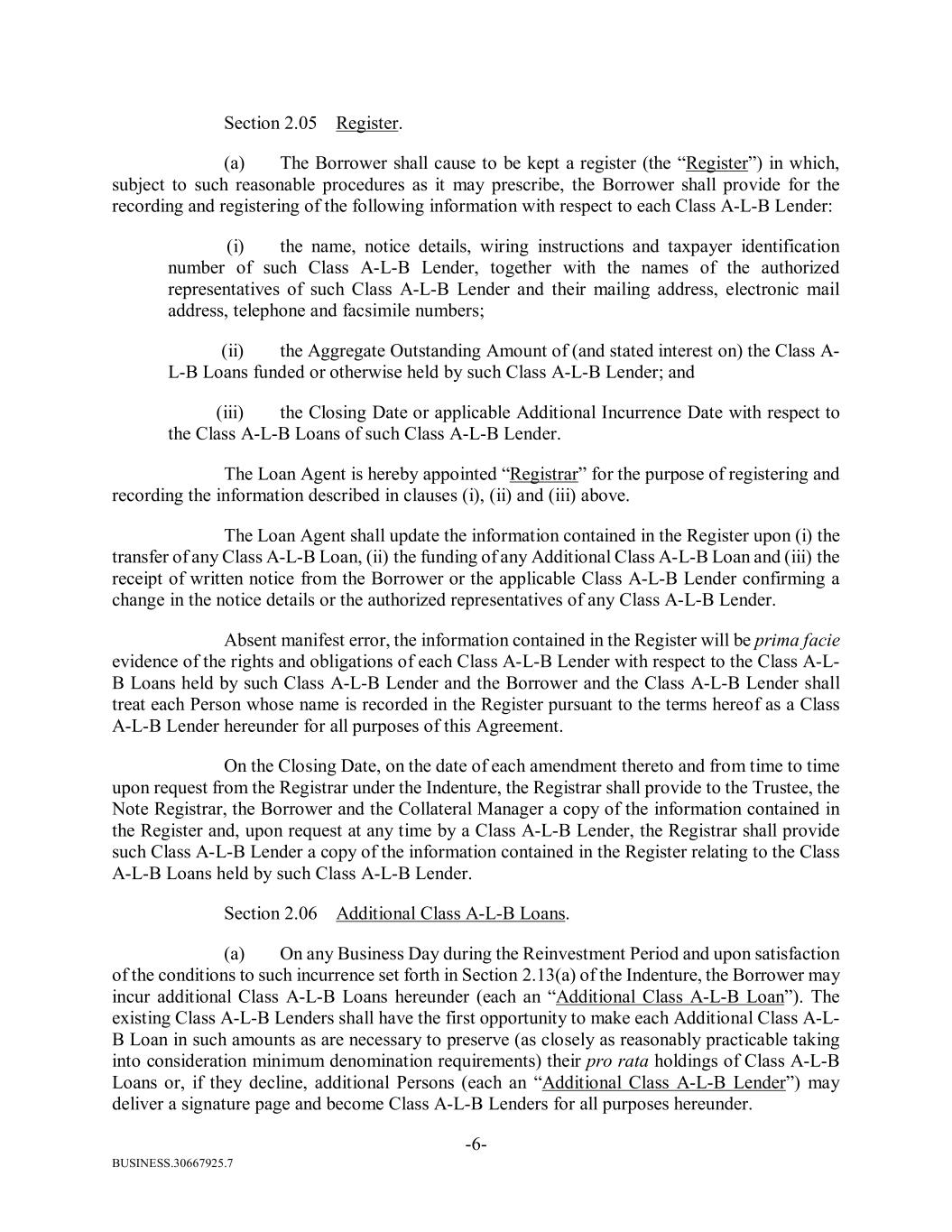 BUSINESS.30667925.7 -6- Section 2.05 Register. (a) The Borrower shall cause to be kept a register (the “Register”) in which, subject to such reasonable procedures as it may prescribe, the Borrower shall provide for the recording and registering of the following information with respect to each Class A-L-B Lender: (i) the name, notice details, wiring instructions and taxpayer identification number of such Class A-L-B Lender, together with the names of the authorized representatives of such Class A-L-B Lender and their mailing address, electronic mail address, telephone and facsimile numbers; (ii) the Aggregate Outstanding Amount of (and stated interest on) the Class A- L-B Loans funded or otherwise held by such Class A-L-B Lender; and (iii) the Closing Date or applicable Additional Incurrence Date with respect to the Class A-L-B Loans of such Class A-L-B Lender. The Loan Agent is hereby appointed “Registrar” for the purpose of registering and recording the information described in clauses (i), (ii) and (iii) above. The Loan Agent shall update the information contained in the Register upon (i) the transfer of any Class A-L-B Loan, (ii) the funding of any Additional Class A-L-B Loan and (iii) the receipt of written notice from the Borrower or the applicable Class A-L-B Lender confirming a change in the notice details or the authorized representatives of any Class A-L-B Lender. Absent manifest error, the information contained in the Register will be prima facie evidence of the rights and obligations of each Class A-L-B Lender with respect to the Class A-L- B Loans held by such Class A-L-B Lender and the Borrower and the Class A-L-B Lender shall treat each Person whose name is recorded in the Register pursuant to the terms hereof as a Class A-L-B Lender hereunder for all purposes of this Agreement. On the Closing Date, on the date of each amendment thereto and from time to time upon request from the Registrar under the Indenture, the Registrar shall provide to the Trustee, the Note Registrar, the Borrower and the Collateral Manager a copy of the information contained in the Register and, upon request at any time by a Class A-L-B Lender, the Registrar shall provide such Class A-L-B Lender a copy of the information contained in the Register relating to the Class A-L-B Loans held by such Class A-L-B Lender. Section 2.06 Additional Class A-L-B Loans. (a) On any Business Day during the Reinvestment Period and upon satisfaction of the conditions to such incurrence set forth in Section 2.13(a) of the Indenture, the Borrower may incur additional Class A-L-B Loans hereunder (each an “Additional Class A-L-B Loan”). The existing Class A-L-B Lenders shall have the first opportunity to make each Additional Class A-L- B Loan in such amounts as are necessary to preserve (as closely as reasonably practicable taking into consideration minimum denomination requirements) their pro rata holdings of Class A-L-B Loans or, if they decline, additional Persons (each an “Additional Class A-L-B Lender”) may deliver a signature page and become Class A-L-B Lenders for all purposes hereunder.