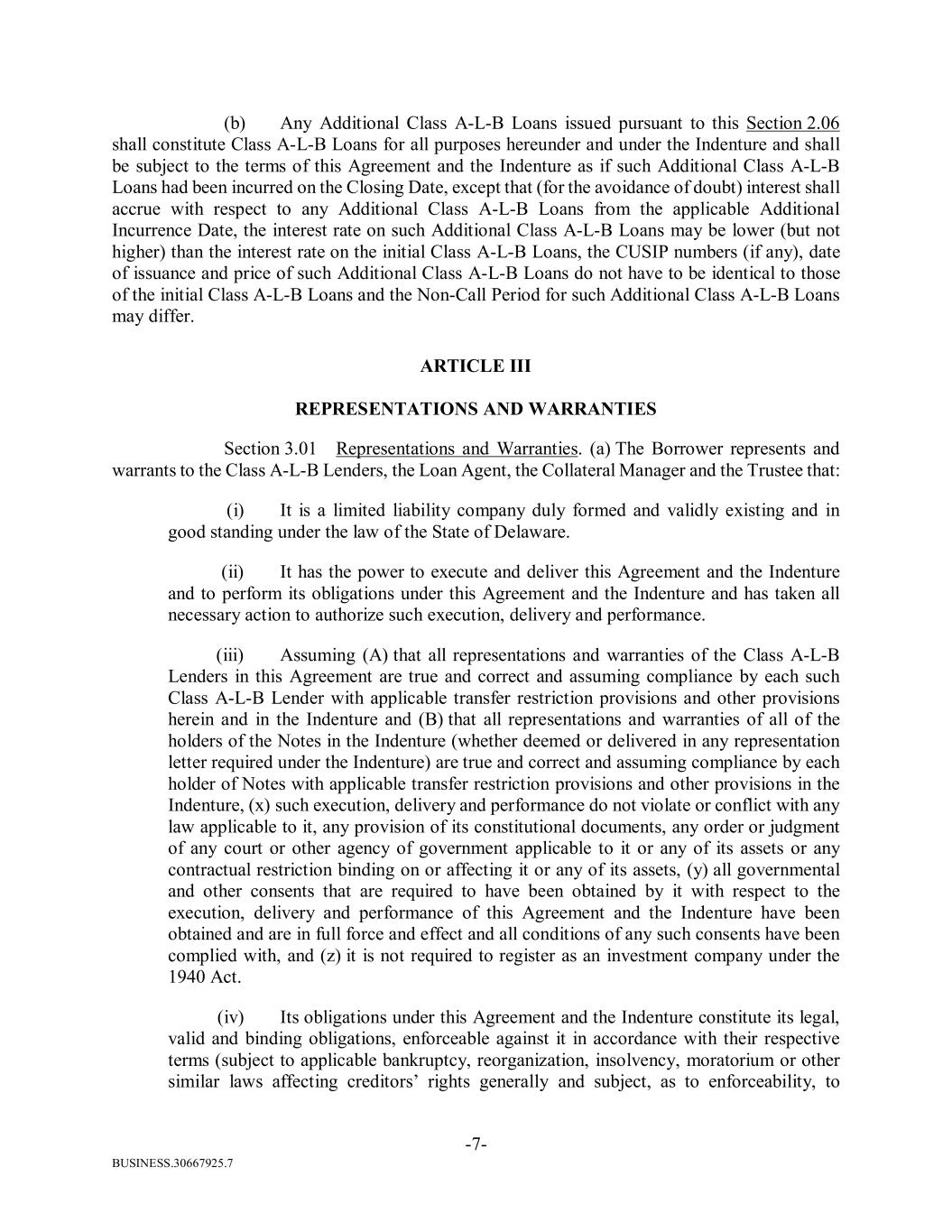 BUSINESS.30667925.7 -7- (b) Any Additional Class A-L-B Loans issued pursuant to this Section 2.06 shall constitute Class A-L-B Loans for all purposes hereunder and under the Indenture and shall be subject to the terms of this Agreement and the Indenture as if such Additional Class A-L-B Loans had been incurred on the Closing Date, except that (for the avoidance of doubt) interest shall accrue with respect to any Additional Class A-L-B Loans from the applicable Additional Incurrence Date, the interest rate on such Additional Class A-L-B Loans may be lower (but not higher) than the interest rate on the initial Class A-L-B Loans, the CUSIP numbers (if any), date of issuance and price of such Additional Class A-L-B Loans do not have to be identical to those of the initial Class A-L-B Loans and the Non-Call Period for such Additional Class A-L-B Loans may differ. ARTICLE III REPRESENTATIONS AND WARRANTIES Section 3.01 Representations and Warranties. (a) The Borrower represents and warrants to the Class A-L-B Lenders, the Loan Agent, the Collateral Manager and the Trustee that: (i) It is a limited liability company duly formed and validly existing and in good standing under the law of the State of Delaware. (ii) It has the power to execute and deliver this Agreement and the Indenture and to perform its obligations under this Agreement and the Indenture and has taken all necessary action to authorize such execution, delivery and performance. (iii) Assuming (A) that all representations and warranties of the Class A-L-B Lenders in this Agreement are true and correct and assuming compliance by each such Class A-L-B Lender with applicable transfer restriction provisions and other provisions herein and in the Indenture and (B) that all representations and warranties of all of the holders of the Notes in the Indenture (whether deemed or delivered in any representation letter required under the Indenture) are true and correct and assuming compliance by each holder of Notes with applicable transfer restriction provisions and other provisions in the Indenture, (x) such execution, delivery and performance do not violate or conflict with any law applicable to it, any provision of its constitutional documents, any order or judgment of any court or other agency of government applicable to it or any of its assets or any contractual restriction binding on or affecting it or any of its assets, (y) all governmental and other consents that are required to have been obtained by it with respect to the execution, delivery and performance of this Agreement and the Indenture have been obtained and are in full force and effect and all conditions of any such consents have been complied with, and (z) it is not required to register as an investment company under the 1940 Act. (iv) Its obligations under this Agreement and the Indenture constitute its legal, valid and binding obligations, enforceable against it in accordance with their respective terms (subject to applicable bankruptcy, reorganization, insolvency, moratorium or other similar laws affecting creditors’ rights generally and subject, as to enforceability, to