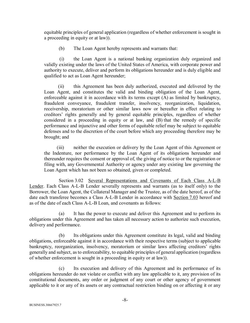 BUSINESS.30667925.7 -8- equitable principles of general application (regardless of whether enforcement is sought in a proceeding in equity or at law)). (b) The Loan Agent hereby represents and warrants that: (i) the Loan Agent is a national banking organization duly organized and validly existing under the laws of the United States of America, with corporate power and authority to execute, deliver and perform its obligations hereunder and is duly eligible and qualified to act as Loan Agent hereunder; (ii) this Agreement has been duly authorized, executed and delivered by the Loan Agent, and constitutes the valid and binding obligation of the Loan Agent, enforceable against it in accordance with its terms except (A) as limited by bankruptcy, fraudulent conveyance, fraudulent transfer, insolvency, reorganization, liquidation, receivership, moratorium or other similar laws now or hereafter in effect relating to creditors’ rights generally and by general equitable principles, regardless of whether considered in a proceeding in equity or at law, and (B) that the remedy of specific performance and injunctive and other forms of equitable relief may be subject to equitable defenses and to the discretion of the court before which any proceeding therefore may be brought; and (iii) neither the execution or delivery by the Loan Agent of this Agreement or the Indenture, nor performance by the Loan Agent of its obligations hereunder and thereunder requires the consent or approval of, the giving of notice to or the registration or filing with, any Governmental Authority or agency under any existing law governing the Loan Agent which has not been so obtained, given or completed. Section 3.02 Several Representations and Covenants of Each Class A-L-B Lender. Each Class A-L-B Lender severally represents and warrants (as to itself only) to the Borrower, the Loan Agent, the Collateral Manager and the Trustee, as of the date hereof, as of the date each transferee becomes a Class A-L-B Lender in accordance with Section 7.03 hereof and as of the date of each Class A-L-B Loan, and covenants as follows: (a) It has the power to execute and deliver this Agreement and to perform its obligations under this Agreement and has taken all necessary action to authorize such execution, delivery and performance. (b) Its obligations under this Agreement constitute its legal, valid and binding obligations, enforceable against it in accordance with their respective terms (subject to applicable bankruptcy, reorganization, insolvency, moratorium or similar laws affecting creditors’ rights generally and subject, as to enforceability, to equitable principles of general application (regardless of whether enforcement is sought in a proceeding in equity or at law)). (c) Its execution and delivery of this Agreement and its performance of its obligations hereunder do not violate or conflict with any law applicable to it, any provision of its constitutional documents, any order or judgment of any court or other agency of government applicable to it or any of its assets or any contractual restriction binding on or affecting it or any