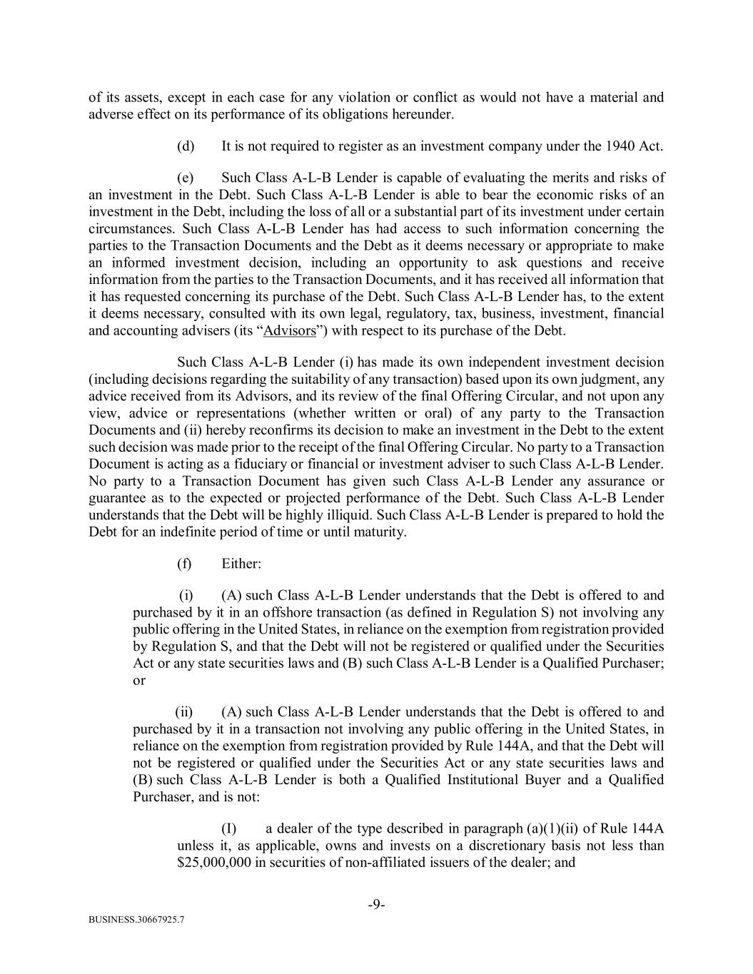 BUSINESS.30667925.7 -9- of its assets, except in each case for any violation or conflict as would not have a material and adverse effect on its performance of its obligations hereunder. (d) It is not required to register as an investment company under the 1940 Act. (e) Such Class A-L-B Lender is capable of evaluating the merits and risks of an investment in the Debt. Such Class A-L-B Lender is able to bear the economic risks of an investment in the Debt, including the loss of all or a substantial part of its investment under certain circumstances. Such Class A-L-B Lender has had access to such information concerning the parties to the Transaction Documents and the Debt as it deems necessary or appropriate to make an informed investment decision, including an opportunity to ask questions and receive information from the parties to the Transaction Documents, and it has received all information that it has requested concerning its purchase of the Debt. Such Class A-L-B Lender has, to the extent it deems necessary, consulted with its own legal, regulatory, tax, business, investment, financial and accounting advisers (its “Advisors”) with respect to its purchase of the Debt. Such Class A-L-B Lender (i) has made its own independent investment decision (including decisions regarding the suitability of any transaction) based upon its own judgment, any advice received from its Advisors, and its review of the final Offering Circular, and not upon any view, advice or representations (whether written or oral) of any party to the Transaction Documents and (ii) hereby reconfirms its decision to make an investment in the Debt to the extent such decision was made prior to the receipt of the final Offering Circular. No party to a Transaction Document is acting as a fiduciary or financial or investment adviser to such Class A-L-B Lender. No party to a Transaction Document has given such Class A-L-B Lender any assurance or guarantee as to the expected or projected performance of the Debt. Such Class A-L-B Lender understands that the Debt will be highly illiquid. Such Class A-L-B Lender is prepared to hold the Debt for an indefinite period of time or until maturity. (f) Either: (i) (A) such Class A-L-B Lender understands that the Debt is offered to and purchased by it in an offshore transaction (as defined in Regulation S) not involving any public offering in the United States, in reliance on the exemption from registration provided by Regulation S, and that the Debt will not be registered or qualified under the Securities Act or any state securities laws and (B) such Class A-L-B Lender is a Qualified Purchaser; or (ii) (A) such Class A-L-B Lender understands that the Debt is offered to and purchased by it in a transaction not involving any public offering in the United States, in reliance on the exemption from registration provided by Rule 144A, and that the Debt will not be registered or qualified under the Securities Act or any state securities laws and (B) such Class A-L-B Lender is both a Qualified Institutional Buyer and a Qualified Purchaser, and is not: (I) a dealer of the type described in paragraph (a)(1)(ii) of Rule 144A unless it, as applicable, owns and invests on a discretionary basis not less than $25,000,000 in securities of non-affiliated issuers of the dealer; and