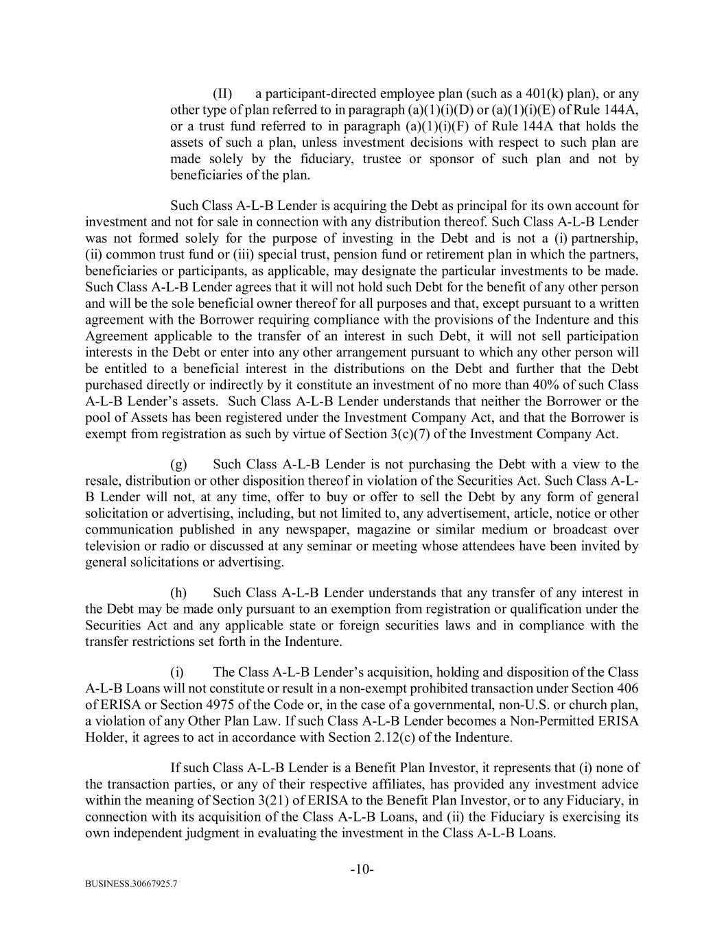 BUSINESS.30667925.7 -10- (II) a participant-directed employee plan (such as a 401(k) plan), or any other type of plan referred to in paragraph (a)(1)(i)(D) or (a)(1)(i)(E) of Rule 144A, or a trust fund referred to in paragraph (a)(1)(i)(F) of Rule 144A that holds the assets of such a plan, unless investment decisions with respect to such plan are made solely by the fiduciary, trustee or sponsor of such plan and not by beneficiaries of the plan. Such Class A-L-B Lender is acquiring the Debt as principal for its own account for investment and not for sale in connection with any distribution thereof. Such Class A-L-B Lender was not formed solely for the purpose of investing in the Debt and is not a (i) partnership, (ii) common trust fund or (iii) special trust, pension fund or retirement plan in which the partners, beneficiaries or participants, as applicable, may designate the particular investments to be made. Such Class A-L-B Lender agrees that it will not hold such Debt for the benefit of any other person and will be the sole beneficial owner thereof for all purposes and that, except pursuant to a written agreement with the Borrower requiring compliance with the provisions of the Indenture and this Agreement applicable to the transfer of an interest in such Debt, it will not sell participation interests in the Debt or enter into any other arrangement pursuant to which any other person will be entitled to a beneficial interest in the distributions on the Debt and further that the Debt purchased directly or indirectly by it constitute an investment of no more than 40% of such Class A-L-B Lender’s assets. Such Class A-L-B Lender understands that neither the Borrower or the pool of Assets has been registered under the Investment Company Act, and that the Borrower is exempt from registration as such by virtue of Section 3(c)(7) of the Investment Company Act. (g) Such Class A-L-B Lender is not purchasing the Debt with a view to the resale, distribution or other disposition thereof in violation of the Securities Act. Such Class A-L- B Lender will not, at any time, offer to buy or offer to sell the Debt by any form of general solicitation or advertising, including, but not limited to, any advertisement, article, notice or other communication published in any newspaper, magazine or similar medium or broadcast over television or radio or discussed at any seminar or meeting whose attendees have been invited by general solicitations or advertising. (h) Such Class A-L-B Lender understands that any transfer of any interest in the Debt may be made only pursuant to an exemption from registration or qualification under the Securities Act and any applicable state or foreign securities laws and in compliance with the transfer restrictions set forth in the Indenture. (i) The Class A-L-B Lender’s acquisition, holding and disposition of the Class A-L-B Loans will not constitute or result in a non-exempt prohibited transaction under Section 406 of ERISA or Section 4975 of the Code or, in the case of a governmental, non-U.S. or church plan, a violation of any Other Plan Law. If such Class A-L-B Lender becomes a Non-Permitted ERISA Holder, it agrees to act in accordance with Section 2.12(c) of the Indenture. If such Class A-L-B Lender is a Benefit Plan Investor, it represents that (i) none of the transaction parties, or any of their respective affiliates, has provided any investment advice within the meaning of Section 3(21) of ERISA to the Benefit Plan Investor, or to any Fiduciary, in connection with its acquisition of the Class A-L-B Loans, and (ii) the Fiduciary is exercising its own independent judgment in evaluating the investment in the Class A-L-B Loans.