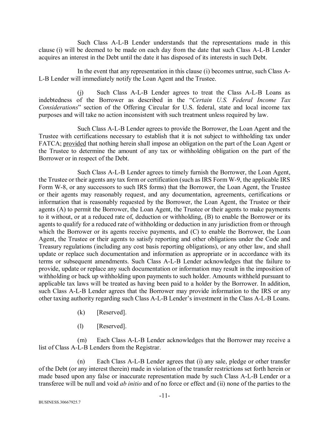BUSINESS.30667925.7 -11- Such Class A-L-B Lender understands that the representations made in this clause (i) will be deemed to be made on each day from the date that such Class A-L-B Lender acquires an interest in the Debt until the date it has disposed of its interests in such Debt. In the event that any representation in this clause (i) becomes untrue, such Class A- L-B Lender will immediately notify the Loan Agent and the Trustee. (j) Such Class A-L-B Lender agrees to treat the Class A-L-B Loans as indebtedness of the Borrower as described in the “Certain U.S. Federal Income Tax Considerations” section of the Offering Circular for U.S. federal, state and local income tax purposes and will take no action inconsistent with such treatment unless required by law. Such Class A-L-B Lender agrees to provide the Borrower, the Loan Agent and the Trustee with certifications necessary to establish that it is not subject to withholding tax under FATCA; provided that nothing herein shall impose an obligation on the part of the Loan Agent or the Trustee to determine the amount of any tax or withholding obligation on the part of the Borrower or in respect of the Debt. Such Class A-L-B Lender agrees to timely furnish the Borrower, the Loan Agent, the Trustee or their agents any tax form or certification (such as IRS Form W-9, the applicable IRS Form W-8, or any successors to such IRS forms) that the Borrower, the Loan Agent, the Trustee or their agents may reasonably request, and any documentation, agreements, certifications or information that is reasonably requested by the Borrower, the Loan Agent, the Trustee or their agents (A) to permit the Borrower, the Loan Agent, the Trustee or their agents to make payments to it without, or at a reduced rate of, deduction or withholding, (B) to enable the Borrower or its agents to qualify for a reduced rate of withholding or deduction in any jurisdiction from or through which the Borrower or its agents receive payments, and (C) to enable the Borrower, the Loan Agent, the Trustee or their agents to satisfy reporting and other obligations under the Code and Treasury regulations (including any cost basis reporting obligations), or any other law, and shall update or replace such documentation and information as appropriate or in accordance with its terms or subsequent amendments. Such Class A-L-B Lender acknowledges that the failure to provide, update or replace any such documentation or information may result in the imposition of withholding or back up withholding upon payments to such holder. Amounts withheld pursuant to applicable tax laws will be treated as having been paid to a holder by the Borrower. In addition, such Class A-L-B Lender agrees that the Borrower may provide information to the IRS or any other taxing authority regarding such Class A-L-B Lender’s investment in the Class A-L-B Loans. (k) [Reserved]. (l) [Reserved]. (m) Each Class A-L-B Lender acknowledges that the Borrower may receive a list of Class A-L-B Lenders from the Registrar. (n) Each Class A-L-B Lender agrees that (i) any sale, pledge or other transfer of the Debt (or any interest therein) made in violation of the transfer restrictions set forth herein or made based upon any false or inaccurate representation made by such Class A-L-B Lender or a transferee will be null and void ab initio and of no force or effect and (ii) none of the parties to the