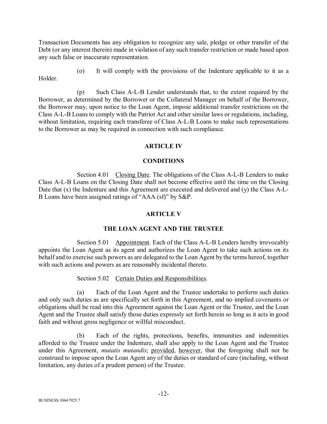 BUSINESS.30667925.7 -12- Transaction Documents has any obligation to recognize any sale, pledge or other transfer of the Debt (or any interest therein) made in violation of any such transfer restriction or made based upon any such false or inaccurate representation. (o) It will comply with the provisions of the Indenture applicable to it as a Holder. (p) Such Class A-L-B Lender understands that, to the extent required by the Borrower, as determined by the Borrower or the Collateral Manager on behalf of the Borrower, the Borrower may, upon notice to the Loan Agent, impose additional transfer restrictions on the Class A-L-B Loans to comply with the Patriot Act and other similar laws or regulations, including, without limitation, requiring each transferee of Class A-L-B Loans to make such representations to the Borrower as may be required in connection with such compliance. ARTICLE IV CONDITIONS Section 4.01 Closing Date. The obligations of the Class A-L-B Lenders to make Class A-L-B Loans on the Closing Date shall not become effective until the time on the Closing Date that (x) the Indenture and this Agreement are executed and delivered and (y) the Class A-L- B Loans have been assigned ratings of “AAA (sf)” by S&P. ARTICLE V THE LOAN AGENT AND THE TRUSTEE Section 5.01 Appointment. Each of the Class A-L-B Lenders hereby irrevocably appoints the Loan Agent as its agent and authorizes the Loan Agent to take such actions on its behalf and to exercise such powers as are delegated to the Loan Agent by the terms hereof, together with such actions and powers as are reasonably incidental thereto. Section 5.02 Certain Duties and Responsibilities. (a) Each of the Loan Agent and the Trustee undertake to perform such duties and only such duties as are specifically set forth in this Agreement, and no implied covenants or obligations shall be read into this Agreement against the Loan Agent or the Trustee, and the Loan Agent and the Trustee shall satisfy those duties expressly set forth herein so long as it acts in good faith and without gross negligence or willful misconduct. (b) Each of the rights, protections, benefits, immunities and indemnities afforded to the Trustee under the Indenture, shall also apply to the Loan Agent and the Trustee under this Agreement, mutatis mutandis; provided, however, that the foregoing shall not be construed to impose upon the Loan Agent any of the duties or standard of care (including, without limitation, any duties of a prudent person) of the Trustee.