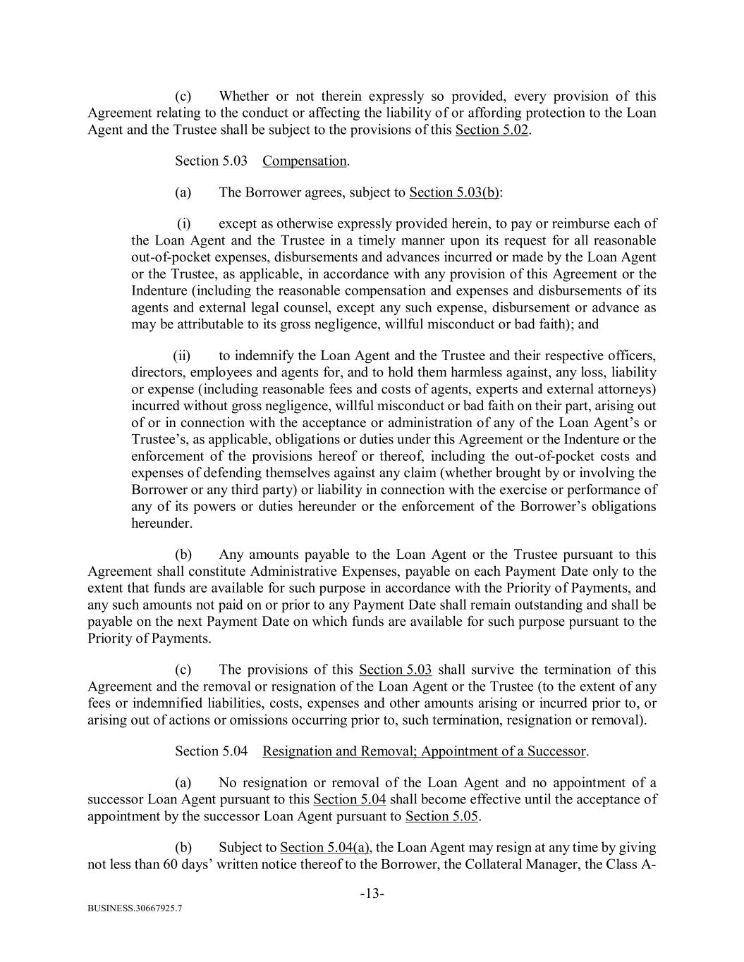 BUSINESS.30667925.7 -13- (c) Whether or not therein expressly so provided, every provision of this Agreement relating to the conduct or affecting the liability of or affording protection to the Loan Agent and the Trustee shall be subject to the provisions of this Section 5.02. Section 5.03 Compensation. (a) The Borrower agrees, subject to Section 5.03(b): (i) except as otherwise expressly provided herein, to pay or reimburse each of the Loan Agent and the Trustee in a timely manner upon its request for all reasonable out-of-pocket expenses, disbursements and advances incurred or made by the Loan Agent or the Trustee, as applicable, in accordance with any provision of this Agreement or the Indenture (including the reasonable compensation and expenses and disbursements of its agents and external legal counsel, except any such expense, disbursement or advance as may be attributable to its gross negligence, willful misconduct or bad faith); and (ii) to indemnify the Loan Agent and the Trustee and their respective officers, directors, employees and agents for, and to hold them harmless against, any loss, liability or expense (including reasonable fees and costs of agents, experts and external attorneys) incurred without gross negligence, willful misconduct or bad faith on their part, arising out of or in connection with the acceptance or administration of any of the Loan Agent’s or Trustee’s, as applicable, obligations or duties under this Agreement or the Indenture or the enforcement of the provisions hereof or thereof, including the out-of-pocket costs and expenses of defending themselves against any claim (whether brought by or involving the Borrower or any third party) or liability in connection with the exercise or performance of any of its powers or duties hereunder or the enforcement of the Borrower’s obligations hereunder. (b) Any amounts payable to the Loan Agent or the Trustee pursuant to this Agreement shall constitute Administrative Expenses, payable on each Payment Date only to the extent that funds are available for such purpose in accordance with the Priority of Payments, and any such amounts not paid on or prior to any Payment Date shall remain outstanding and shall be payable on the next Payment Date on which funds are available for such purpose pursuant to the Priority of Payments. (c) The provisions of this Section 5.03 shall survive the termination of this Agreement and the removal or resignation of the Loan Agent or the Trustee (to the extent of any fees or indemnified liabilities, costs, expenses and other amounts arising or incurred prior to, or arising out of actions or omissions occurring prior to, such termination, resignation or removal). Section 5.04 Resignation and Removal; Appointment of a Successor. (a) No resignation or removal of the Loan Agent and no appointment of a successor Loan Agent pursuant to this Section 5.04 shall become effective until the acceptance of appointment by the successor Loan Agent pursuant to Section 5.05. (b) Subject to Section 5.04(a), the Loan Agent may resign at any time by giving not less than 60 days’ written notice thereof to the Borrower, the Collateral Manager, the Class A-