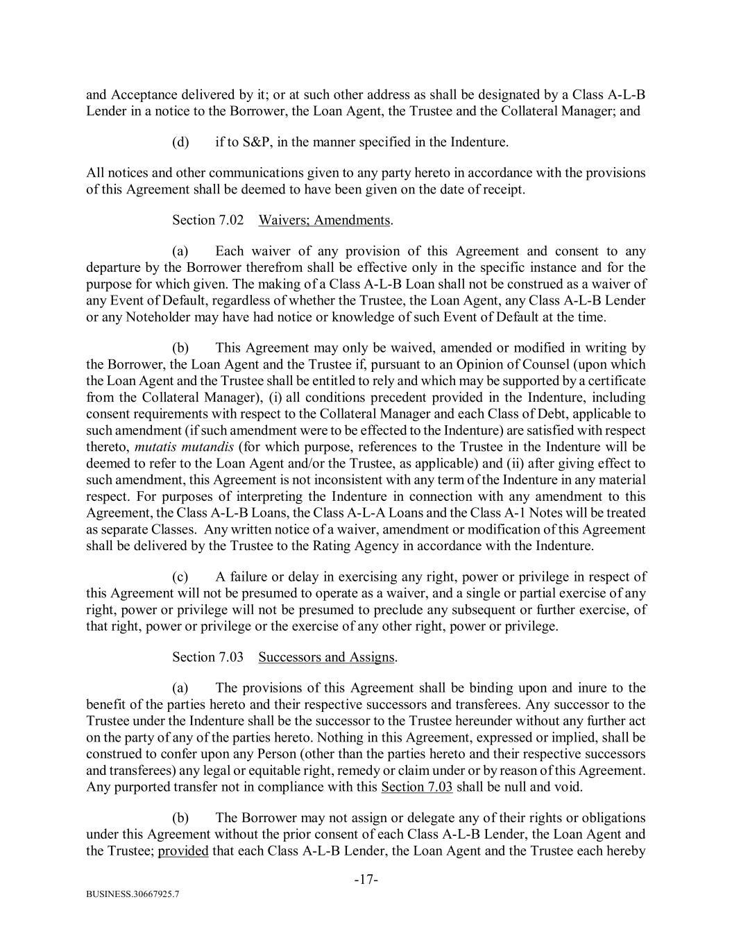 BUSINESS.30667925.7 -17- and Acceptance delivered by it; or at such other address as shall be designated by a Class A-L-B Lender in a notice to the Borrower, the Loan Agent, the Trustee and the Collateral Manager; and (d) if to S&P, in the manner specified in the Indenture. All notices and other communications given to any party hereto in accordance with the provisions of this Agreement shall be deemed to have been given on the date of receipt. Section 7.02 Waivers; Amendments. (a) Each waiver of any provision of this Agreement and consent to any departure by the Borrower therefrom shall be effective only in the specific instance and for the purpose for which given. The making of a Class A-L-B Loan shall not be construed as a waiver of any Event of Default, regardless of whether the Trustee, the Loan Agent, any Class A-L-B Lender or any Noteholder may have had notice or knowledge of such Event of Default at the time. (b) This Agreement may only be waived, amended or modified in writing by the Borrower, the Loan Agent and the Trustee if, pursuant to an Opinion of Counsel (upon which the Loan Agent and the Trustee shall be entitled to rely and which may be supported by a certificate from the Collateral Manager), (i) all conditions precedent provided in the Indenture, including consent requirements with respect to the Collateral Manager and each Class of Debt, applicable to such amendment (if such amendment were to be effected to the Indenture) are satisfied with respect thereto, mutatis mutandis (for which purpose, references to the Trustee in the Indenture will be deemed to refer to the Loan Agent and/or the Trustee, as applicable) and (ii) after giving effect to such amendment, this Agreement is not inconsistent with any term of the Indenture in any material respect. For purposes of interpreting the Indenture in connection with any amendment to this Agreement, the Class A-L-B Loans, the Class A-L-A Loans and the Class A-1 Notes will be treated as separate Classes. Any written notice of a waiver, amendment or modification of this Agreement shall be delivered by the Trustee to the Rating Agency in accordance with the Indenture. (c) A failure or delay in exercising any right, power or privilege in respect of this Agreement will not be presumed to operate as a waiver, and a single or partial exercise of any right, power or privilege will not be presumed to preclude any subsequent or further exercise, of that right, power or privilege or the exercise of any other right, power or privilege. Section 7.03 Successors and Assigns. (a) The provisions of this Agreement shall be binding upon and inure to the benefit of the parties hereto and their respective successors and transferees. Any successor to the Trustee under the Indenture shall be the successor to the Trustee hereunder without any further act on the party of any of the parties hereto. Nothing in this Agreement, expressed or implied, shall be construed to confer upon any Person (other than the parties hereto and their respective successors and transferees) any legal or equitable right, remedy or claim under or by reason of this Agreement. Any purported transfer not in compliance with this Section 7.03 shall be null and void. (b) The Borrower may not assign or delegate any of their rights or obligations under this Agreement without the prior consent of each Class A-L-B Lender, the Loan Agent and the Trustee; provided that each Class A-L-B Lender, the Loan Agent and the Trustee each hereby