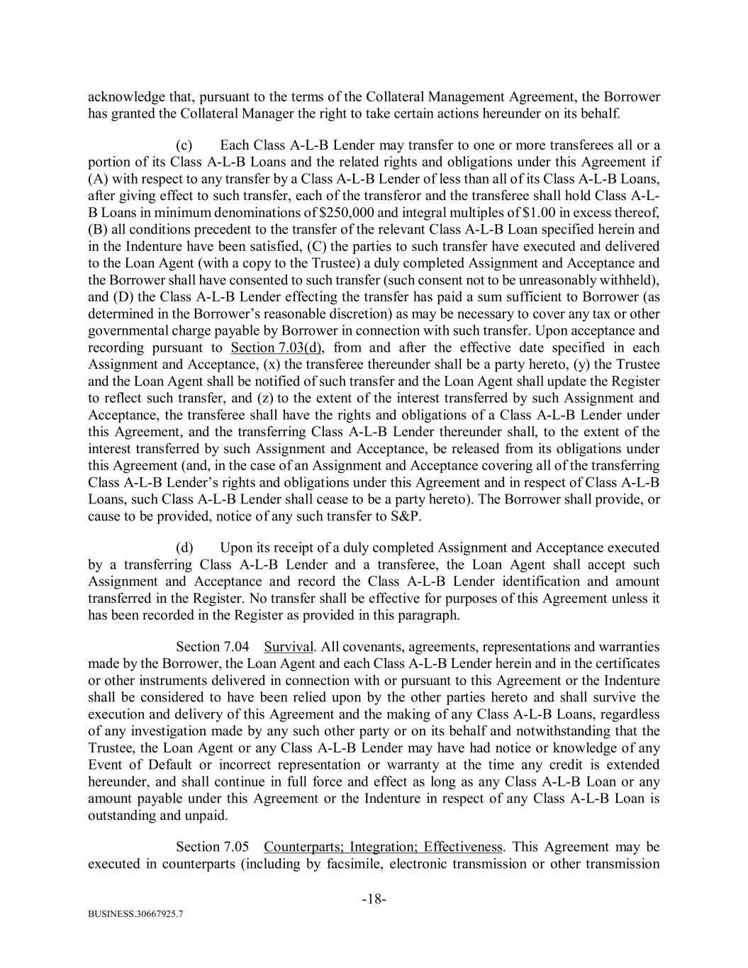 BUSINESS.30667925.7 -18- acknowledge that, pursuant to the terms of the Collateral Management Agreement, the Borrower has granted the Collateral Manager the right to take certain actions hereunder on its behalf. (c) Each Class A-L-B Lender may transfer to one or more transferees all or a portion of its Class A-L-B Loans and the related rights and obligations under this Agreement if (A) with respect to any transfer by a Class A-L-B Lender of less than all of its Class A-L-B Loans, after giving effect to such transfer, each of the transferor and the transferee shall hold Class A-L- B Loans in minimum denominations of $250,000 and integral multiples of $1.00 in excess thereof, (B) all conditions precedent to the transfer of the relevant Class A-L-B Loan specified herein and in the Indenture have been satisfied, (C) the parties to such transfer have executed and delivered to the Loan Agent (with a copy to the Trustee) a duly completed Assignment and Acceptance and the Borrower shall have consented to such transfer (such consent not to be unreasonably withheld), and (D) the Class A-L-B Lender effecting the transfer has paid a sum sufficient to Borrower (as determined in the Borrower’s reasonable discretion) as may be necessary to cover any tax or other governmental charge payable by Borrower in connection with such transfer. Upon acceptance and recording pursuant to Section 7.03(d), from and after the effective date specified in each Assignment and Acceptance, (x) the transferee thereunder shall be a party hereto, (y) the Trustee and the Loan Agent shall be notified of such transfer and the Loan Agent shall update the Register to reflect such transfer, and (z) to the extent of the interest transferred by such Assignment and Acceptance, the transferee shall have the rights and obligations of a Class A-L-B Lender under this Agreement, and the transferring Class A-L-B Lender thereunder shall, to the extent of the interest transferred by such Assignment and Acceptance, be released from its obligations under this Agreement (and, in the case of an Assignment and Acceptance covering all of the transferring Class A-L-B Lender’s rights and obligations under this Agreement and in respect of Class A-L-B Loans, such Class A-L-B Lender shall cease to be a party hereto). The Borrower shall provide, or cause to be provided, notice of any such transfer to S&P. (d) Upon its receipt of a duly completed Assignment and Acceptance executed by a transferring Class A-L-B Lender and a transferee, the Loan Agent shall accept such Assignment and Acceptance and record the Class A-L-B Lender identification and amount transferred in the Register. No transfer shall be effective for purposes of this Agreement unless it has been recorded in the Register as provided in this paragraph. Section 7.04 Survival. All covenants, agreements, representations and warranties made by the Borrower, the Loan Agent and each Class A-L-B Lender herein and in the certificates or other instruments delivered in connection with or pursuant to this Agreement or the Indenture shall be considered to have been relied upon by the other parties hereto and shall survive the execution and delivery of this Agreement and the making of any Class A-L-B Loans, regardless of any investigation made by any such other party or on its behalf and notwithstanding that the Trustee, the Loan Agent or any Class A-L-B Lender may have had notice or knowledge of any Event of Default or incorrect representation or warranty at the time any credit is extended hereunder, and shall continue in full force and effect as long as any Class A-L-B Loan or any amount payable under this Agreement or the Indenture in respect of any Class A-L-B Loan is outstanding and unpaid. Section 7.05 Counterparts; Integration; Effectiveness. This Agreement may be executed in counterparts (including by facsimile, electronic transmission or other transmission