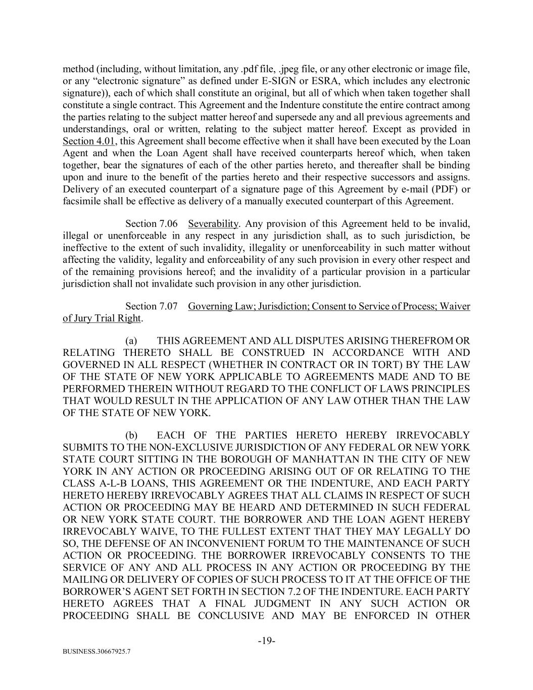 BUSINESS.30667925.7 -19- method (including, without limitation, any .pdf file, .jpeg file, or any other electronic or image file, or any “electronic signature” as defined under E-SIGN or ESRA, which includes any electronic signature)), each of which shall constitute an original, but all of which when taken together shall constitute a single contract. This Agreement and the Indenture constitute the entire contract among the parties relating to the subject matter hereof and supersede any and all previous agreements and understandings, oral or written, relating to the subject matter hereof. Except as provided in Section 4.01, this Agreement shall become effective when it shall have been executed by the Loan Agent and when the Loan Agent shall have received counterparts hereof which, when taken together, bear the signatures of each of the other parties hereto, and thereafter shall be binding upon and inure to the benefit of the parties hereto and their respective successors and assigns. Delivery of an executed counterpart of a signature page of this Agreement by e-mail (PDF) or facsimile shall be effective as delivery of a manually executed counterpart of this Agreement. Section 7.06 Severability. Any provision of this Agreement held to be invalid, illegal or unenforceable in any respect in any jurisdiction shall, as to such jurisdiction, be ineffective to the extent of such invalidity, illegality or unenforceability in such matter without affecting the validity, legality and enforceability of any such provision in every other respect and of the remaining provisions hereof; and the invalidity of a particular provision in a particular jurisdiction shall not invalidate such provision in any other jurisdiction. Section 7.07 Governing Law; Jurisdiction; Consent to Service of Process; Waiver of Jury Trial Right. (a) THIS AGREEMENT AND ALL DISPUTES ARISING THEREFROM OR RELATING THERETO SHALL BE CONSTRUED IN ACCORDANCE WITH AND GOVERNED IN ALL RESPECT (WHETHER IN CONTRACT OR IN TORT) BY THE LAW OF THE STATE OF NEW YORK APPLICABLE TO AGREEMENTS MADE AND TO BE PERFORMED THEREIN WITHOUT REGARD TO THE CONFLICT OF LAWS PRINCIPLES THAT WOULD RESULT IN THE APPLICATION OF ANY LAW OTHER THAN THE LAW OF THE STATE OF NEW YORK. (b) EACH OF THE PARTIES HERETO HEREBY IRREVOCABLY SUBMITS TO THE NON-EXCLUSIVE JURISDICTION OF ANY FEDERAL OR NEW YORK STATE COURT SITTING IN THE BOROUGH OF MANHATTAN IN THE CITY OF NEW YORK IN ANY ACTION OR PROCEEDING ARISING OUT OF OR RELATING TO THE CLASS A-L-B LOANS, THIS AGREEMENT OR THE INDENTURE, AND EACH PARTY HERETO HEREBY IRREVOCABLY AGREES THAT ALL CLAIMS IN RESPECT OF SUCH ACTION OR PROCEEDING MAY BE HEARD AND DETERMINED IN SUCH FEDERAL OR NEW YORK STATE COURT. THE BORROWER AND THE LOAN AGENT HEREBY IRREVOCABLY WAIVE, TO THE FULLEST EXTENT THAT THEY MAY LEGALLY DO SO, THE DEFENSE OF AN INCONVENIENT FORUM TO THE MAINTENANCE OF SUCH ACTION OR PROCEEDING. THE BORROWER IRREVOCABLY CONSENTS TO THE SERVICE OF ANY AND ALL PROCESS IN ANY ACTION OR PROCEEDING BY THE MAILING OR DELIVERY OF COPIES OF SUCH PROCESS TO IT AT THE OFFICE OF THE BORROWER’S AGENT SET FORTH IN SECTION 7.2 OF THE INDENTURE. EACH PARTY HERETO AGREES THAT A FINAL JUDGMENT IN ANY SUCH ACTION OR PROCEEDING SHALL BE CONCLUSIVE AND MAY BE ENFORCED IN OTHER