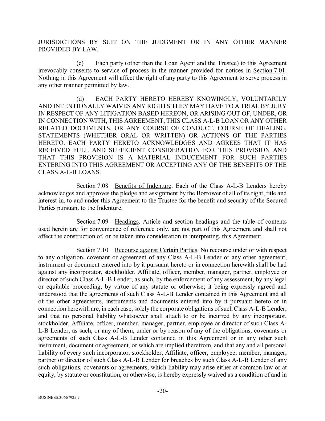 BUSINESS.30667925.7 -20- JURISDICTIONS BY SUIT ON THE JUDGMENT OR IN ANY OTHER MANNER PROVIDED BY LAW. (c) Each party (other than the Loan Agent and the Trustee) to this Agreement irrevocably consents to service of process in the manner provided for notices in Section 7.01. Nothing in this Agreement will affect the right of any party to this Agreement to serve process in any other manner permitted by law. (d) EACH PARTY HERETO HEREBY KNOWINGLY, VOLUNTARILY AND INTENTIONALLY WAIVES ANY RIGHTS THEY MAY HAVE TO A TRIAL BY JURY IN RESPECT OF ANY LITIGATION BASED HEREON, OR ARISING OUT OF, UNDER, OR IN CONNECTION WITH, THIS AGREEMENT, THIS CLASS A-L-B LOAN OR ANY OTHER RELATED DOCUMENTS, OR ANY COURSE OF CONDUCT, COURSE OF DEALING, STATEMENTS (WHETHER ORAL OR WRITTEN) OR ACTIONS OF THE PARTIES HERETO. EACH PARTY HERETO ACKNOWLEDGES AND AGREES THAT IT HAS RECEIVED FULL AND SUFFICIENT CONSIDERATION FOR THIS PROVISION AND THAT THIS PROVISION IS A MATERIAL INDUCEMENT FOR SUCH PARTIES ENTERING INTO THIS AGREEMENT OR ACCEPTING ANY OF THE BENEFITS OF THE CLASS A-L-B LOANS. Section 7.08 Benefits of Indenture. Each of the Class A-L-B Lenders hereby acknowledges and approves the pledge and assignment by the Borrower of all of its right, title and interest in, to and under this Agreement to the Trustee for the benefit and security of the Secured Parties pursuant to the Indenture. Section 7.09 Headings. Article and section headings and the table of contents used herein are for convenience of reference only, are not part of this Agreement and shall not affect the construction of, or be taken into consideration in interpreting, this Agreement. Section 7.10 Recourse against Certain Parties. No recourse under or with respect to any obligation, covenant or agreement of any Class A-L-B Lender or any other agreement, instrument or document entered into by it pursuant hereto or in connection herewith shall be had against any incorporator, stockholder, Affiliate, officer, member, manager, partner, employee or director of such Class A-L-B Lender, as such, by the enforcement of any assessment, by any legal or equitable proceeding, by virtue of any statute or otherwise; it being expressly agreed and understood that the agreements of such Class A-L-B Lender contained in this Agreement and all of the other agreements, instruments and documents entered into by it pursuant hereto or in connection herewith are, in each case, solely the corporate obligations of such Class A-L-B Lender, and that no personal liability whatsoever shall attach to or be incurred by any incorporator, stockholder, Affiliate, officer, member, manager, partner, employee or director of such Class A- L-B Lender, as such, or any of them, under or by reason of any of the obligations, covenants or agreements of such Class A-L-B Lender contained in this Agreement or in any other such instrument, document or agreement, or which are implied therefrom, and that any and all personal liability of every such incorporator, stockholder, Affiliate, officer, employee, member, manager, partner or director of such Class A-L-B Lender for breaches by such Class A-L-B Lender of any such obligations, covenants or agreements, which liability may arise either at common law or at equity, by statute or constitution, or otherwise, is hereby expressly waived as a condition of and in
