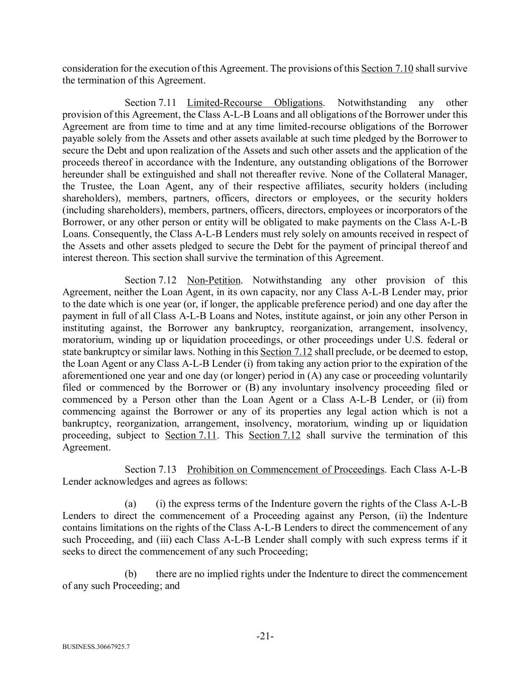 BUSINESS.30667925.7 -21- consideration for the execution of this Agreement. The provisions of this Section 7.10 shall survive the termination of this Agreement. Section 7.11 Limited-Recourse Obligations. Notwithstanding any other provision of this Agreement, the Class A-L-B Loans and all obligations of the Borrower under this Agreement are from time to time and at any time limited-recourse obligations of the Borrower payable solely from the Assets and other assets available at such time pledged by the Borrower to secure the Debt and upon realization of the Assets and such other assets and the application of the proceeds thereof in accordance with the Indenture, any outstanding obligations of the Borrower hereunder shall be extinguished and shall not thereafter revive. None of the Collateral Manager, the Trustee, the Loan Agent, any of their respective affiliates, security holders (including shareholders), members, partners, officers, directors or employees, or the security holders (including shareholders), members, partners, officers, directors, employees or incorporators of the Borrower, or any other person or entity will be obligated to make payments on the Class A-L-B Loans. Consequently, the Class A-L-B Lenders must rely solely on amounts received in respect of the Assets and other assets pledged to secure the Debt for the payment of principal thereof and interest thereon. This section shall survive the termination of this Agreement. Section 7.12 Non-Petition. Notwithstanding any other provision of this Agreement, neither the Loan Agent, in its own capacity, nor any Class A-L-B Lender may, prior to the date which is one year (or, if longer, the applicable preference period) and one day after the payment in full of all Class A-L-B Loans and Notes, institute against, or join any other Person in instituting against, the Borrower any bankruptcy, reorganization, arrangement, insolvency, moratorium, winding up or liquidation proceedings, or other proceedings under U.S. federal or state bankruptcy or similar laws. Nothing in this Section 7.12 shall preclude, or be deemed to estop, the Loan Agent or any Class A-L-B Lender (i) from taking any action prior to the expiration of the aforementioned one year and one day (or longer) period in (A) any case or proceeding voluntarily filed or commenced by the Borrower or (B) any involuntary insolvency proceeding filed or commenced by a Person other than the Loan Agent or a Class A-L-B Lender, or (ii) from commencing against the Borrower or any of its properties any legal action which is not a bankruptcy, reorganization, arrangement, insolvency, moratorium, winding up or liquidation proceeding, subject to Section 7.11. This Section 7.12 shall survive the termination of this Agreement. Section 7.13 Prohibition on Commencement of Proceedings. Each Class A-L-B Lender acknowledges and agrees as follows: (a) (i) the express terms of the Indenture govern the rights of the Class A-L-B Lenders to direct the commencement of a Proceeding against any Person, (ii) the Indenture contains limitations on the rights of the Class A-L-B Lenders to direct the commencement of any such Proceeding, and (iii) each Class A-L-B Lender shall comply with such express terms if it seeks to direct the commencement of any such Proceeding; (b) there are no implied rights under the Indenture to direct the commencement of any such Proceeding; and