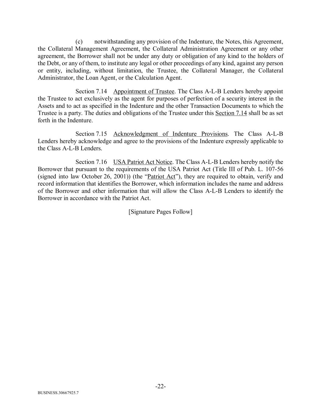 BUSINESS.30667925.7 -22- (c) notwithstanding any provision of the Indenture, the Notes, this Agreement, the Collateral Management Agreement, the Collateral Administration Agreement or any other agreement, the Borrower shall not be under any duty or obligation of any kind to the holders of the Debt, or any of them, to institute any legal or other proceedings of any kind, against any person or entity, including, without limitation, the Trustee, the Collateral Manager, the Collateral Administrator, the Loan Agent, or the Calculation Agent. Section 7.14 Appointment of Trustee. The Class A-L-B Lenders hereby appoint the Trustee to act exclusively as the agent for purposes of perfection of a security interest in the Assets and to act as specified in the Indenture and the other Transaction Documents to which the Trustee is a party. The duties and obligations of the Trustee under this Section 7.14 shall be as set forth in the Indenture. Section 7.15 Acknowledgment of Indenture Provisions. The Class A-L-B Lenders hereby acknowledge and agree to the provisions of the Indenture expressly applicable to the Class A-L-B Lenders. Section 7.16 USA Patriot Act Notice. The Class A-L-B Lenders hereby notify the Borrower that pursuant to the requirements of the USA Patriot Act (Title III of Pub. L. 107-56 (signed into law October 26, 2001)) (the “Patriot Act”), they are required to obtain, verify and record information that identifies the Borrower, which information includes the name and address of the Borrower and other information that will allow the Class A-L-B Lenders to identify the Borrower in accordance with the Patriot Act. [Signature Pages Follow]