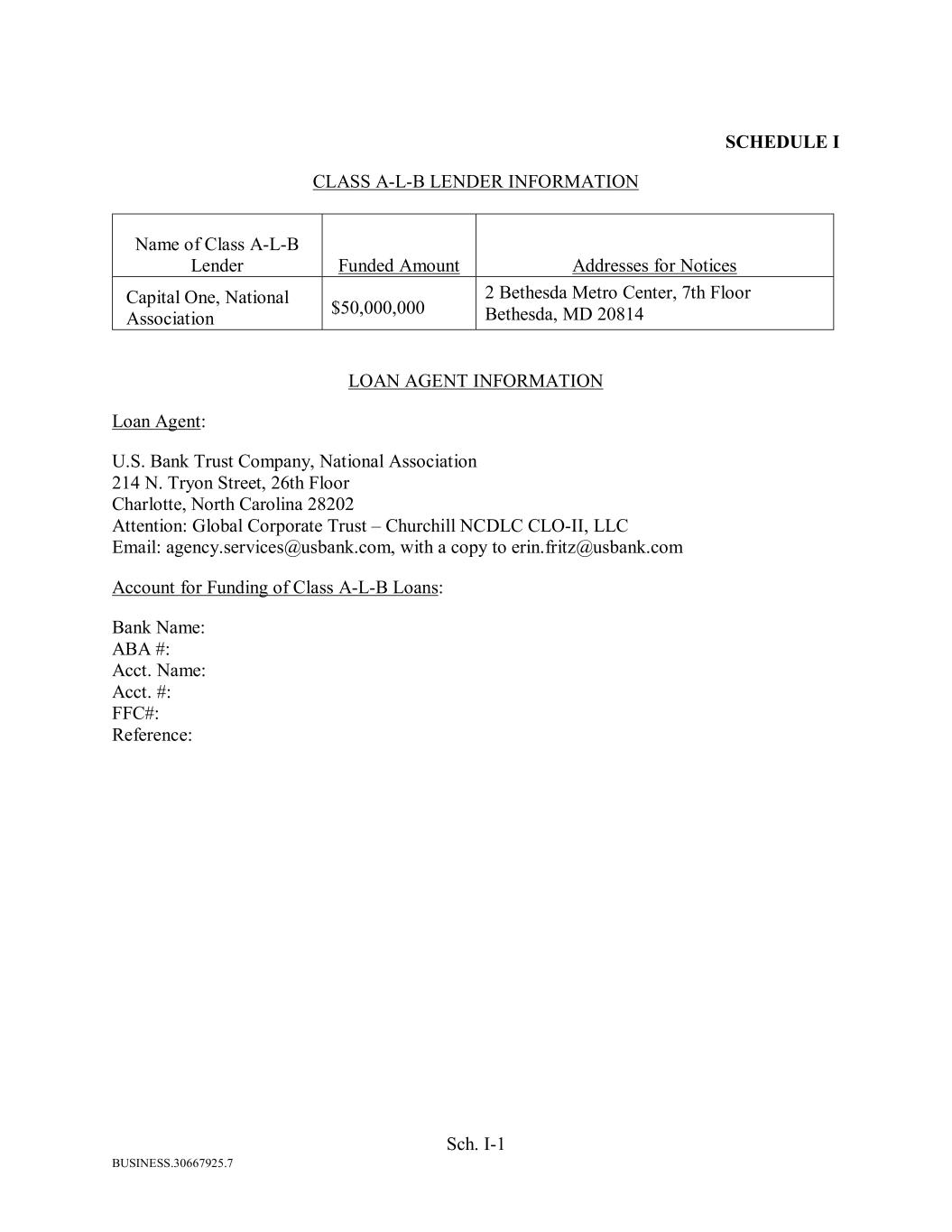 BUSINESS.30667925.7 Sch. I-1 SCHEDULE I CLASS A-L-B LENDER INFORMATION Name of Class A-L-B Lender Funded Amount Addresses for Notices Capital One, National Association $50,000,000 2 Bethesda Metro Center, 7th Floor Bethesda, MD 20814 LOAN AGENT INFORMATION Loan Agent: U.S. Bank Trust Company, National Association 214 N. Tryon Street, 26th Floor Charlotte, North Carolina 28202 Attention: Global Corporate Trust – Churchill NCDLC CLO-II, LLC Email: agency.services@usbank.com, with a copy to erin.fritz@usbank.com Account for Funding of Class A-L-B Loans: Bank Name: ABA #: Acct. Name: Acct. #: FFC#: Reference: