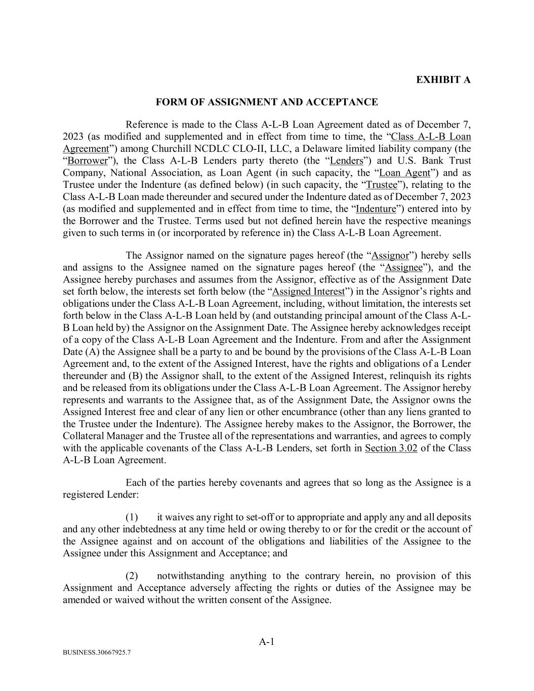 BUSINESS.30667925.7 A-1 EXHIBIT A FORM OF ASSIGNMENT AND ACCEPTANCE Reference is made to the Class A-L-B Loan Agreement dated as of December 7, 2023 (as modified and supplemented and in effect from time to time, the “Class A-L-B Loan Agreement”) among Churchill NCDLC CLO-II, LLC, a Delaware limited liability company (the “Borrower”), the Class A-L-B Lenders party thereto (the “Lenders”) and U.S. Bank Trust Company, National Association, as Loan Agent (in such capacity, the “Loan Agent”) and as Trustee under the Indenture (as defined below) (in such capacity, the “Trustee”), relating to the Class A-L-B Loan made thereunder and secured under the Indenture dated as of December 7, 2023 (as modified and supplemented and in effect from time to time, the “Indenture”) entered into by the Borrower and the Trustee. Terms used but not defined herein have the respective meanings given to such terms in (or incorporated by reference in) the Class A-L-B Loan Agreement. The Assignor named on the signature pages hereof (the “Assignor”) hereby sells and assigns to the Assignee named on the signature pages hereof (the “Assignee”), and the Assignee hereby purchases and assumes from the Assignor, effective as of the Assignment Date set forth below, the interests set forth below (the “Assigned Interest”) in the Assignor’s rights and obligations under the Class A-L-B Loan Agreement, including, without limitation, the interests set forth below in the Class A-L-B Loan held by (and outstanding principal amount of the Class A-L- B Loan held by) the Assignor on the Assignment Date. The Assignee hereby acknowledges receipt of a copy of the Class A-L-B Loan Agreement and the Indenture. From and after the Assignment Date (A) the Assignee shall be a party to and be bound by the provisions of the Class A-L-B Loan Agreement and, to the extent of the Assigned Interest, have the rights and obligations of a Lender thereunder and (B) the Assignor shall, to the extent of the Assigned Interest, relinquish its rights and be released from its obligations under the Class A-L-B Loan Agreement. The Assignor hereby represents and warrants to the Assignee that, as of the Assignment Date, the Assignor owns the Assigned Interest free and clear of any lien or other encumbrance (other than any liens granted to the Trustee under the Indenture). The Assignee hereby makes to the Assignor, the Borrower, the Collateral Manager and the Trustee all of the representations and warranties, and agrees to comply with the applicable covenants of the Class A-L-B Lenders, set forth in Section 3.02 of the Class A-L-B Loan Agreement. Each of the parties hereby covenants and agrees that so long as the Assignee is a registered Lender: (1) it waives any right to set-off or to appropriate and apply any and all deposits and any other indebtedness at any time held or owing thereby to or for the credit or the account of the Assignee against and on account of the obligations and liabilities of the Assignee to the Assignee under this Assignment and Acceptance; and (2) notwithstanding anything to the contrary herein, no provision of this Assignment and Acceptance adversely affecting the rights or duties of the Assignee may be amended or waived without the written consent of the Assignee.