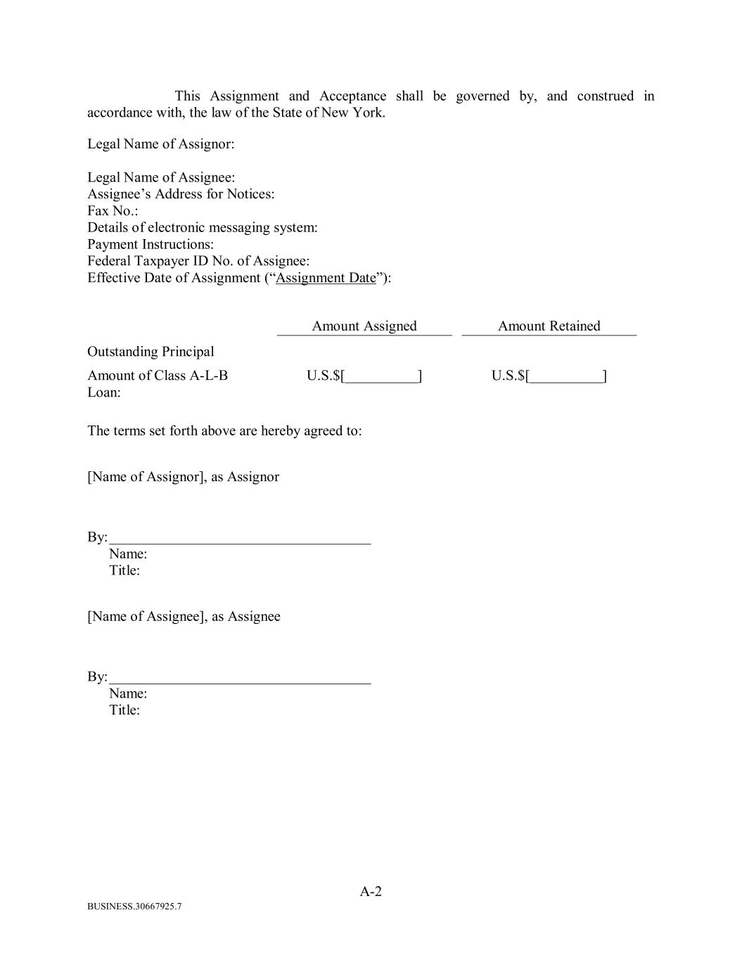 BUSINESS.30667925.7 A-2 This Assignment and Acceptance shall be governed by, and construed in accordance with, the law of the State of New York. Legal Name of Assignor: Legal Name of Assignee: Assignee’s Address for Notices: Fax No.: Details of electronic messaging system: Payment Instructions: Federal Taxpayer ID No. of Assignee: Effective Date of Assignment (“Assignment Date”): Amount Assigned Amount Retained Outstanding Principal Amount of Class A-L-B Loan: U.S.$[__________] U.S.$[__________] The terms set forth above are hereby agreed to: [Name of Assignor], as Assignor By: ____________________________________ Name: Title: [Name of Assignee], as Assignee By: ____________________________________ Name: Title: