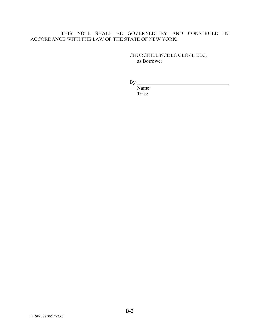 BUSINESS.30667925.7 B-2 THIS NOTE SHALL BE GOVERNED BY AND CONSTRUED IN ACCORDANCE WITH THE LAW OF THE STATE OF NEW YORK. CHURCHILL NCDLC CLO-II, LLC, as Borrower By: ____________________________________ Name: Title: