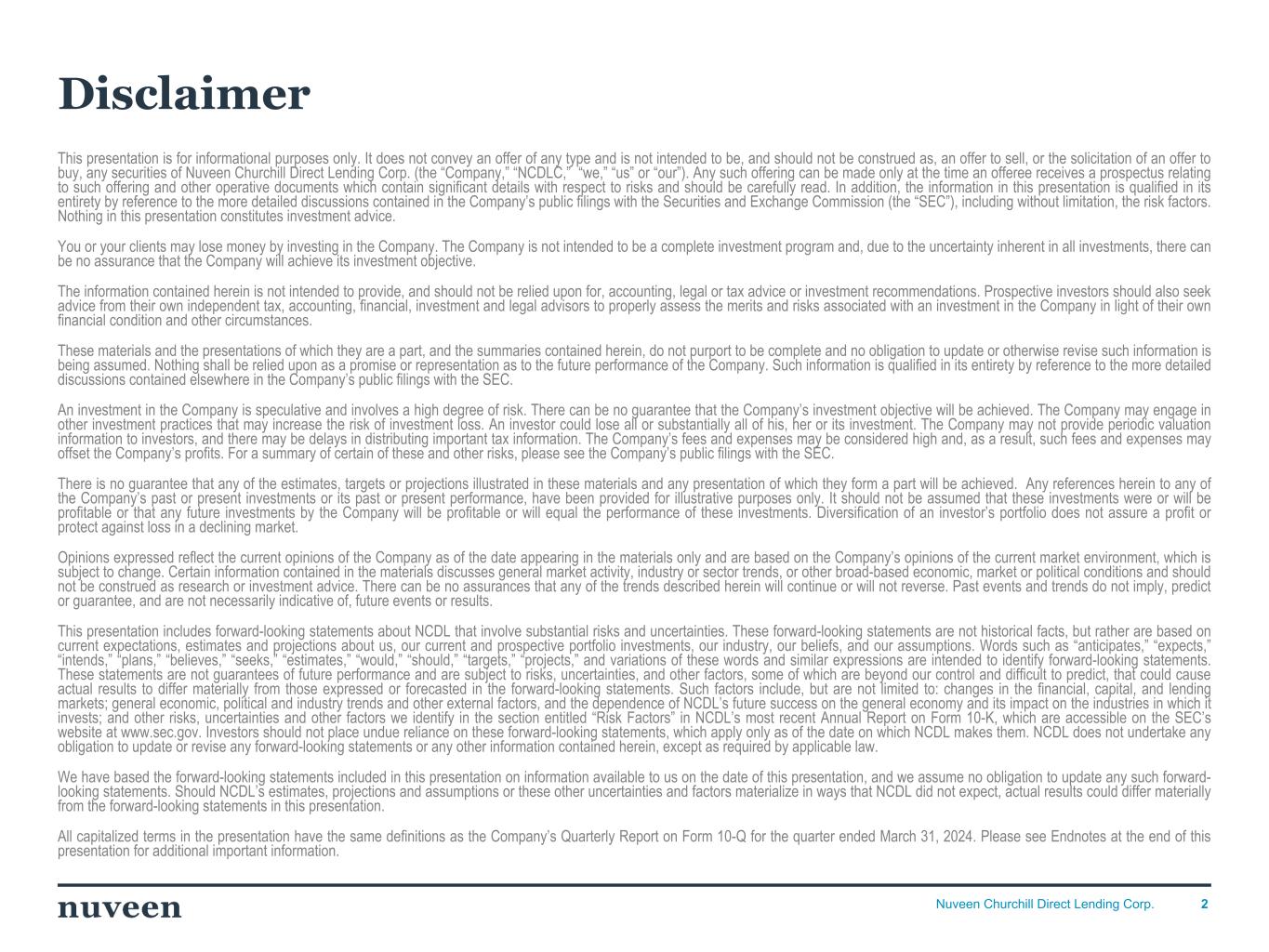 2Nuveen Churchill Direct Lending Corp. Disclaimer This presentation is for informational purposes only. It does not convey an offer of any type and is not intended to be, and should not be construed as, an offer to sell, or the solicitation of an offer to buy, any securities of Nuveen Churchill Direct Lending Corp. (the “Company,” “NCDLC,” “we,” “us” or “our”). Any such offering can be made only at the time an offeree receives a prospectus relating to such offering and other operative documents which contain significant details with respect to risks and should be carefully read. In addition, the information in this presentation is qualified in its entirety by reference to the more detailed discussions contained in the Company’s public filings with the Securities and Exchange Commission (the “SEC”), including without limitation, the risk factors. Nothing in this presentation constitutes investment advice. You or your clients may lose money by investing in the Company. The Company is not intended to be a complete investment program and, due to the uncertainty inherent in all investments, there can be no assurance that the Company will achieve its investment objective. The information contained herein is not intended to provide, and should not be relied upon for, accounting, legal or tax advice or investment recommendations. Prospective investors should also seek advice from their own independent tax, accounting, financial, investment and legal advisors to properly assess the merits and risks associated with an investment in the Company in light of their own financial condition and other circumstances. These materials and the presentations of which they are a part, and the summaries contained herein, do not purport to be complete and no obligation to update or otherwise revise such information is being assumed. Nothing shall be relied upon as a promise or representation as to the future performance of the Company. Such information is qualified in its entirety by reference to the more detailed discussions contained elsewhere in the Company’s public filings with the SEC. An investment in the Company is speculative and involves a high degree of risk. There can be no guarantee that the Company’s investment objective will be achieved. The Company may engage in other investment practices that may increase the risk of investment loss. An investor could lose all or substantially all of his, her or its investment. The Company may not provide periodic valuation information to investors, and there may be delays in distributing important tax information. The Company’s fees and expenses may be considered high and, as a result, such fees and expenses may offset the Company’s profits. For a summary of certain of these and other risks, please see the Company’s public filings with the SEC. There is no guarantee that any of the estimates, targets or projections illustrated in these materials and any presentation of which they form a part will be achieved. Any references herein to any of the Company’s past or present investments or its past or present performance, have been provided for illustrative purposes only. It should not be assumed that these investments were or will be profitable or that any future investments by the Company will be profitable or will equal the performance of these investments. Diversification of an investor’s portfolio does not assure a profit or protect against loss in a declining market. Opinions expressed reflect the current opinions of the Company as of the date appearing in the materials only and are based on the Company’s opinions of the current market environment, which is subject to change. Certain information contained in the materials discusses general market activity, industry or sector trends, or other broad-based economic, market or political conditions and should not be construed as research or investment advice. There can be no assurances that any of the trends described herein will continue or will not reverse. Past events and trends do not imply, predict or guarantee, and are not necessarily indicative of, future events or results. This presentation includes forward-looking statements about NCDL that involve substantial risks and uncertainties. These forward-looking statements are not historical facts, but rather are based on current expectations, estimates and projections about us, our current and prospective portfolio investments, our industry, our beliefs, and our assumptions. Words such as “anticipates,” “expects,” “intends,” “plans,” “believes,” “seeks,” “estimates,” “would,” “should,” “targets,” “projects,” and variations of these words and similar expressions are intended to identify forward-looking statements. These statements are not guarantees of future performance and are subject to risks, uncertainties, and other factors, some of which are beyond our control and difficult to predict, that could cause actual results to differ materially from those expressed or forecasted in the forward-looking statements. Such factors include, but are not limited to: changes in the financial, capital, and lending markets; general economic, political and industry trends and other external factors, and the dependence of NCDL’s future success on the general economy and its impact on the industries in which it invests; and other risks, uncertainties and other factors we identify in the section entitled “Risk Factors” in NCDL’s most recent Annual Report on Form 10-K, which are accessible on the SEC’s website at www.sec.gov. Investors should not place undue reliance on these forward-looking statements, which apply only as of the date on which NCDL makes them. NCDL does not undertake any obligation to update or revise any forward-looking statements or any other information contained herein, except as required by applicable law. We have based the forward-looking statements included in t