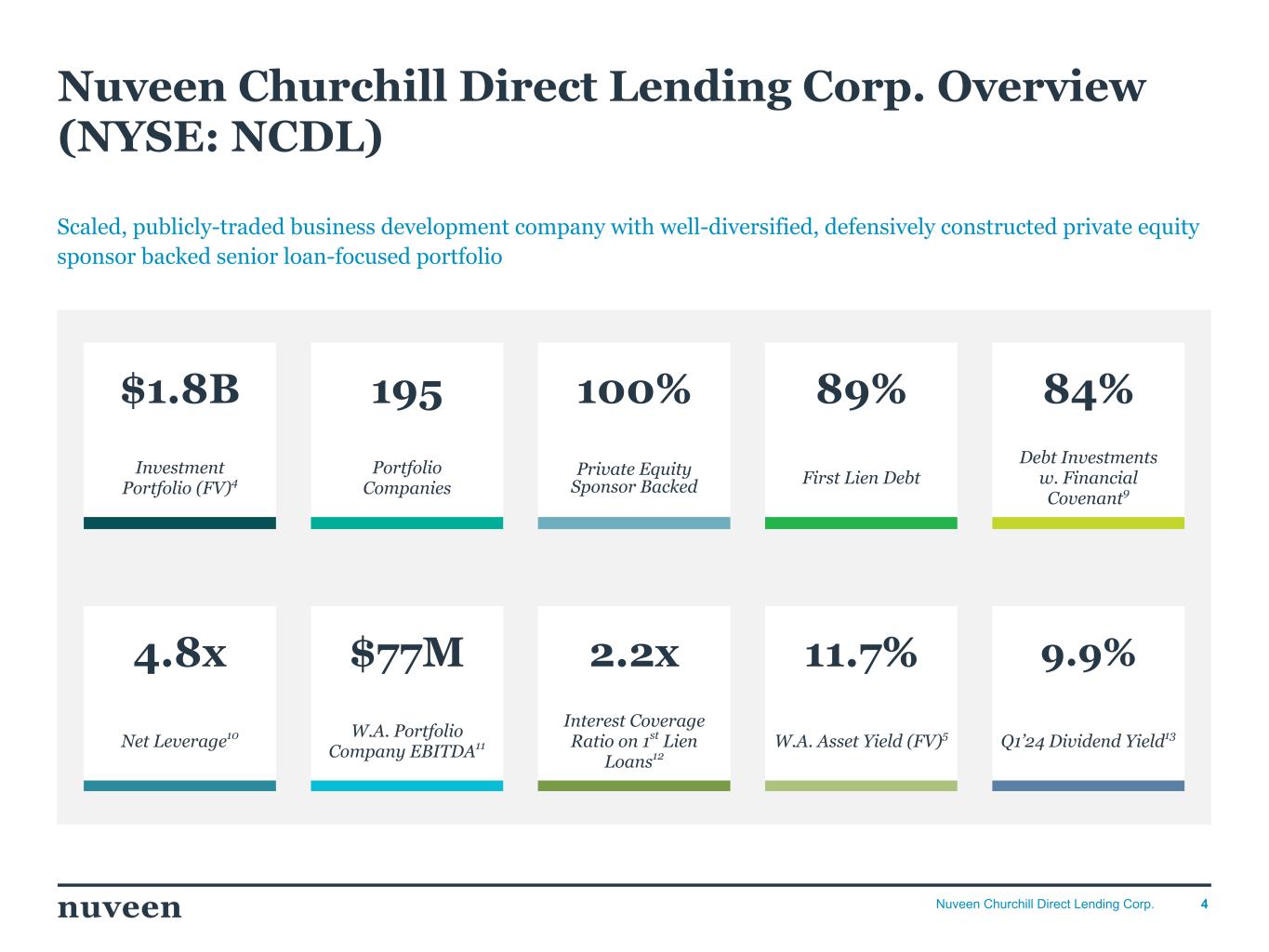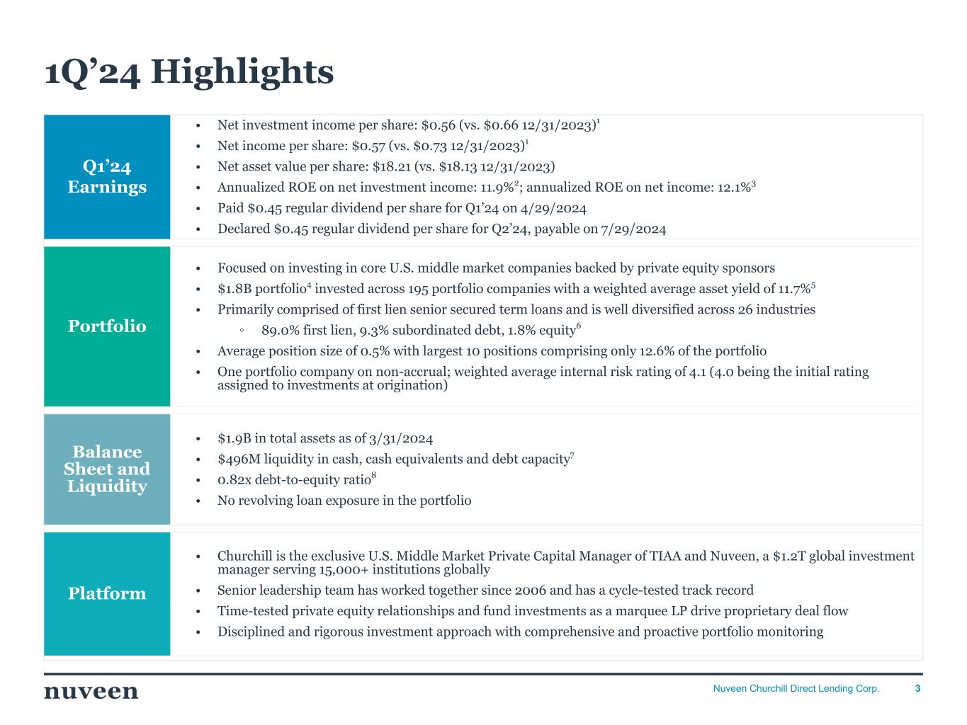 3Nuveen Churchill Direct Lending Corp. Q1’24 Earnings • Net investment income per share: $0.56 (vs. $0.66 12/31/2023)1 • Net income per share: $0.57 (vs. $0.73 12/31/2023)1 • Net asset value per share: $18.21 (vs. $18.13 12/31/2023) • Annualized ROE on net investment income: 11.9%2; annualized ROE on net income: 12.1%3 • Paid $0.45 regular dividend per share for Q1’24 on 4/29/2024 • Declared $0.45 regular dividend per share for Q2’24, payable on 7/29/2024 Portfolio • Focused on investing in core U.S. middle market companies backed by private equity sponsors • $1.8B portfolio4 invested across 195 portfolio companies with a weighted average asset yield of 11.7%5 • Primarily comprised of first lien senior secured term loans and is well diversified across 26 industries ◦ 89.0% first lien, 9.3% subordinated debt, 1.8% equity6 • Average position size of 0.5% with largest 10 positions comprising only 12.6% of the portfolio • One portfolio company on non-accrual; weighted average internal risk rating of 4.1 (4.0 being the initial rating assigned to investments at origination) Balance Sheet and Liquidity • $1.9B in total assets as of 3/31/2024 • $496M liquidity in cash, cash equivalents and debt capacity7 • 0.82x debt-to-equity ratio8 • No revolving loan exposure in the portfolio Platform • Churchill is the exclusive U.S. Middle Market Private Capital Manager of TIAA and Nuveen, a $1.2T global investment manager serving 15,000+ institutions globally • Senior leadership team has worked together since 2006 and has a cycle-tested track record • Time-tested private equity relationships and fund investments as a marquee LP drive proprietary deal flow • Disciplined and rigorous investment approach with comprehensive and proactive portfolio monitoring 1Q’24 Highlights