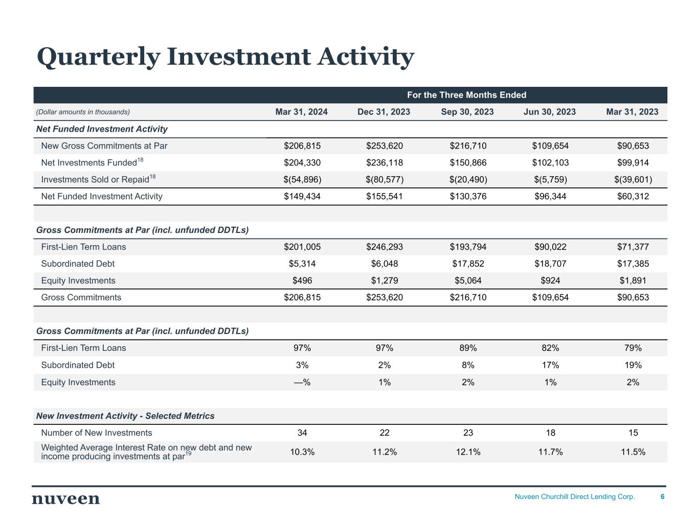 6Nuveen Churchill Direct Lending Corp. For the Three Months Ended (Dollar amounts in thousands) Mar 31, 2024 Dec 31, 2023 Sep 30, 2023 Jun 30, 2023 Mar 31, 2023 Net Funded Investment Activity New Gross Commitments at Par $206,815 $253,620 $216,710 $109,654 $90,653 Net Investments Funded18 $204,330 $236,118 $150,866 $102,103 $99,914 Investments Sold or Repaid18 $(54,896) $(80,577) $(20,490) $(5,759) $(39,601) Net Funded Investment Activity $149,434 $155,541 $130,376 $96,344 $60,312 Gross Commitments at Par (incl. unfunded DDTLs) First-Lien Term Loans $201,005 $246,293 $193,794 $90,022 $71,377 Subordinated Debt $5,314 $6,048 $17,852 $18,707 $17,385 Equity Investments $496 $1,279 $5,064 $924 $1,891 Gross Commitments $206,815 $253,620 $216,710 $109,654 $90,653 Gross Commitments at Par (incl. unfunded DDTLs) First-Lien Term Loans 97% 97% 89% 82% 79% Subordinated Debt 3% 2% 8% 17% 19% Equity Investments —% 1% 2% 1% 2% New Investment Activity - Selected Metrics Number of New Investments 34 22 23 18 15 Weighted Average Interest Rate on new debt and new income producing investments at par19 10.3% 11.2% 12.1% 11.7% 11.5% Quarterly Investment Activity