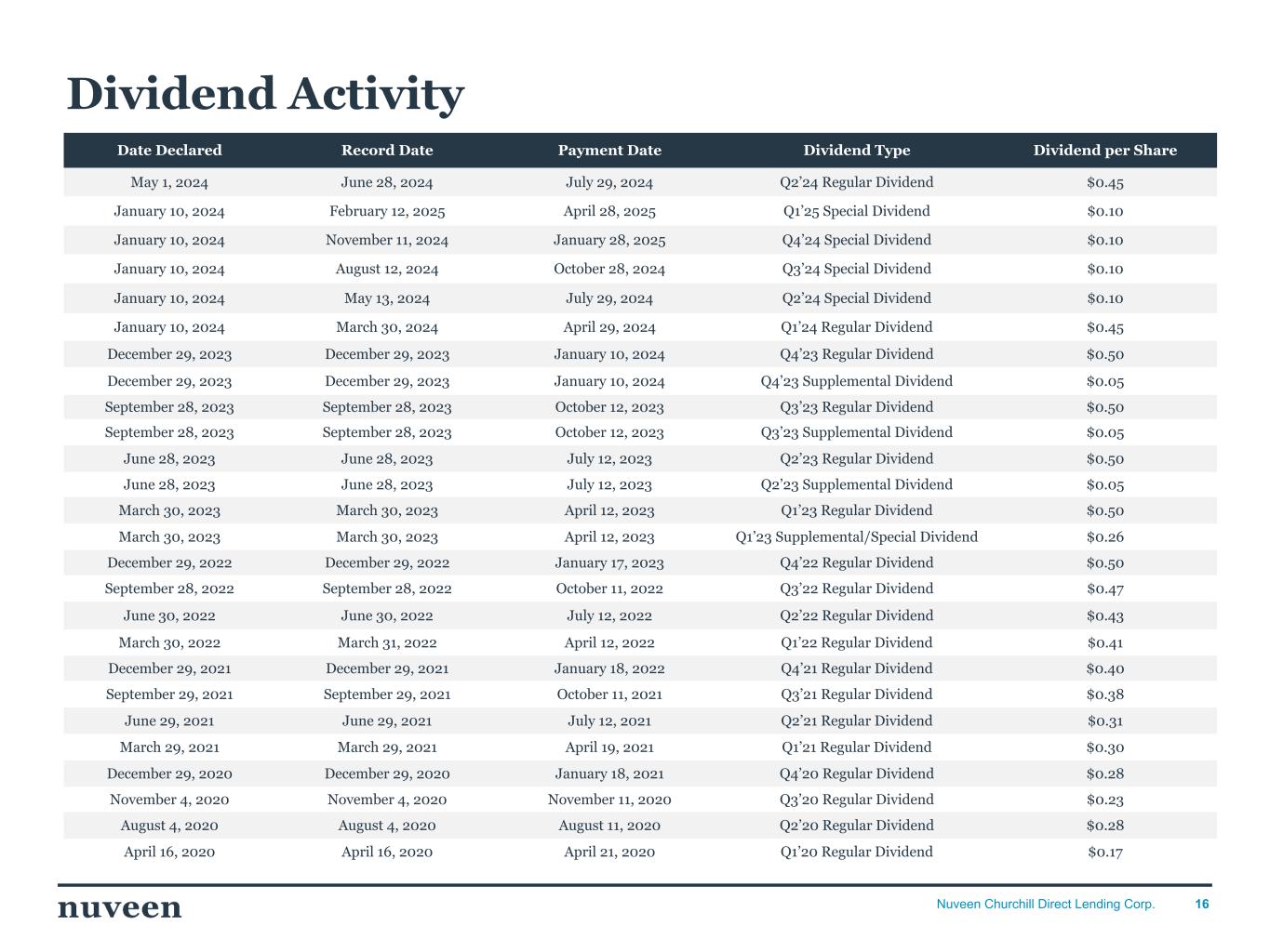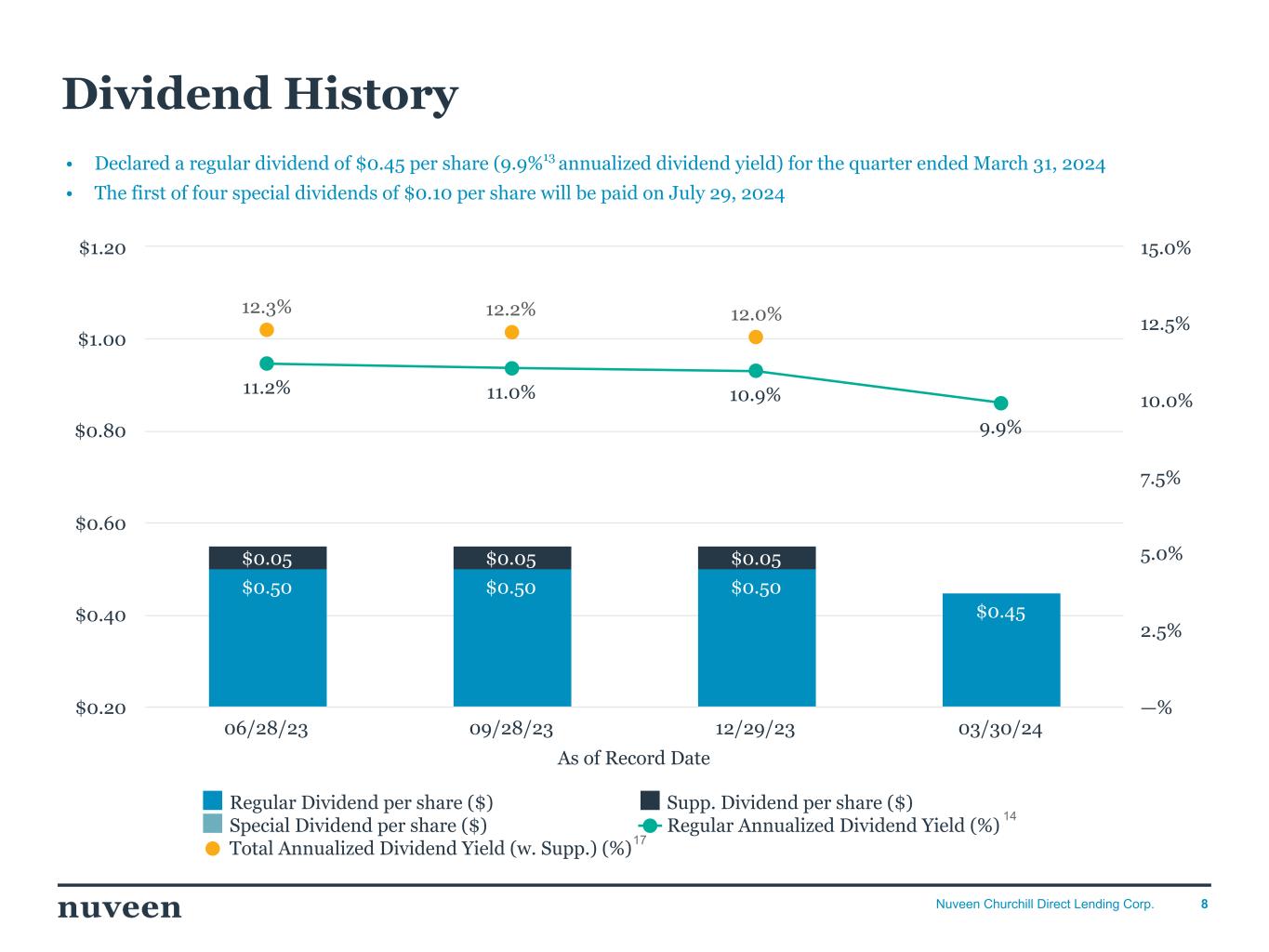 16Nuveen Churchill Direct Lending Corp. Dividend Activity Date Declared Record Date Payment Date Dividend Type Dividend per Share May 1, 2024 June 28, 2024 July 29, 2024 Q2’24 Regular Dividend $0.45 January 10, 2024 February 12, 2025 April 28, 2025 Q1’25 Special Dividend $0.10 January 10, 2024 November 11, 2024 January 28, 2025 Q4’24 Special Dividend $0.10 January 10, 2024 August 12, 2024 October 28, 2024 Q3’24 Special Dividend $0.10 January 10, 2024 May 13, 2024 July 29, 2024 Q2’24 Special Dividend $0.10 January 10, 2024 March 30, 2024 April 29, 2024 Q1’24 Regular Dividend $0.45 December 29, 2023 December 29, 2023 January 10, 2024 Q4’23 Regular Dividend $0.50 December 29, 2023 December 29, 2023 January 10, 2024 Q4’23 Supplemental Dividend $0.05 September 28, 2023 September 28, 2023 October 12, 2023 Q3’23 Regular Dividend $0.50 September 28, 2023 September 28, 2023 October 12, 2023 Q3’23 Supplemental Dividend $0.05 June 28, 2023 June 28, 2023 July 12, 2023 Q2’23 Regular Dividend $0.50 June 28, 2023 June 28, 2023 July 12, 2023 Q2’23 Supplemental Dividend $0.05 March 30, 2023 March 30, 2023 April 12, 2023 Q1’23 Regular Dividend $0.50 March 30, 2023 March 30, 2023 April 12, 2023 Q1’23 Supplemental/Special Dividend $0.26 December 29, 2022 December 29, 2022 January 17, 2023 Q4’22 Regular Dividend $0.50 September 28, 2022 September 28, 2022 October 11, 2022 Q3’22 Regular Dividend $0.47 June 30, 2022 June 30, 2022 July 12, 2022 Q2’22 Regular Dividend $0.43 March 30, 2022 March 31, 2022 April 12, 2022 Q1’22 Regular Dividend $0.41 December 29, 2021 December 29, 2021 January 18, 2022 Q4’21 Regular Dividend $0.40 September 29, 2021 September 29, 2021 October 11, 2021 Q3’21 Regular Dividend $0.38 June 29, 2021 June 29, 2021 July 12, 2021 Q2’21 Regular Dividend $0.31 March 29, 2021 March 29, 2021 April 19, 2021 Q1’21 Regular Dividend $0.30 December 29, 2020 December 29, 2020 January 18, 2021 Q4’20 Regular Dividend $0.28 November 4, 2020 November 4, 2020 November 11, 2020 Q3’20 Regular Dividend $0.23 August 4, 2020 August 4, 2020 August 11, 2020 Q2’20 Regular Dividend $0.28 April 16, 2020 April 16, 2020 April 21, 2020 Q1’20 Regular Dividend $0.17