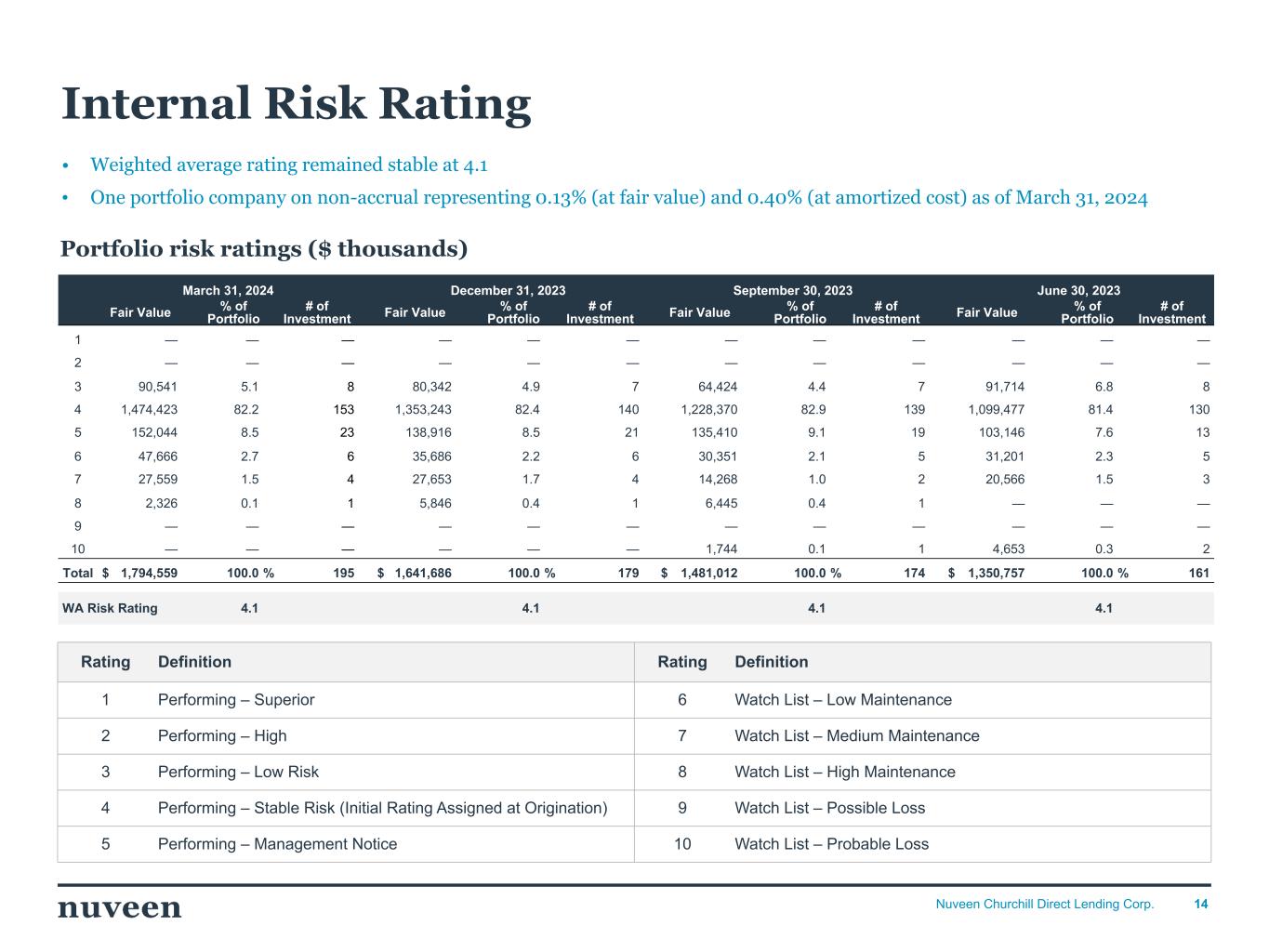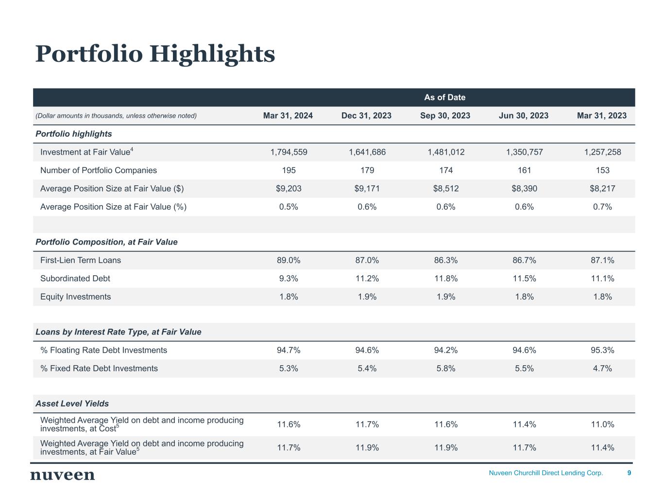 9Nuveen Churchill Direct Lending Corp. As of Date (Dollar amounts in thousands, unless otherwise noted) Mar 31, 2024 Dec 31, 2023 Sep 30, 2023 Jun 30, 2023 Mar 31, 2023 Portfolio highlights Investment at Fair Value4 1,794,559 1,641,686 1,481,012 1,350,757 1,257,258 Number of Portfolio Companies 195 179 174 161 153 Average Position Size at Fair Value ($) $9,203 $9,171 $8,512 $8,390 $8,217 Average Position Size at Fair Value (%) 0.5% 0.6% 0.6% 0.6% 0.7% Portfolio Composition, at Fair Value First-Lien Term Loans 89.0% 87.0% 86.3% 86.7% 87.1% Subordinated Debt 9.3% 11.2% 11.8% 11.5% 11.1% Equity Investments 1.8% 1.9% 1.9% 1.8% 1.8% Loans by Interest Rate Type, at Fair Value % Floating Rate Debt Investments 94.7% 94.6% 94.2% 94.6% 95.3% % Fixed Rate Debt Investments 5.3% 5.4% 5.8% 5.5% 4.7% Asset Level Yields Weighted Average Yield on debt and income producing investments, at Cost5 11.6% 11.7% 11.6% 11.4% 11.0% Weighted Average Yield on debt and income producing investments, at Fair Value5 11.7% 11.9% 11.9% 11.7% 11.4% Portfolio Highlights