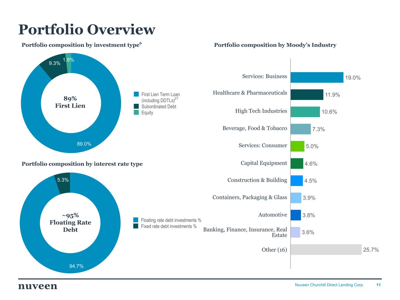 10Nuveen Churchill Direct Lending Corp. V ol u m e ($ M il li on s) Sp read / C ou p on (% ) Investment Activity (QoQ) $91M $110M $217M $254M $207M 6.5% 6.1% 6.1% 5.9% 4.9% 12.7% 13.5% 13.8% 13.0% 13.9% 11.4% 11.0% 11.5% 11.2% 10.2% Volume ($ Millions) Spread (%) Coupon (%) Interest rate on floating rate investments (%) 03/31/23 06/30/23 09/30/23 12/31/23 03/31/24 $0M $100M $200M $300M $400M $500M $600M $700M $800M —% 2.0% 4.0% 6.0% 8.0% 10.0% 12.0% 14.0% • Closed 23 new portfolio investments and 11 add-ons totaling $207M23 • 4.9%24 average spread of new floating rate investments • 13.9%25 average coupon of new fixed rate investments 1Q’24 Investment Activity 15 Investments 23 Investments 26 34 Investments 22 Investments 18 Investments