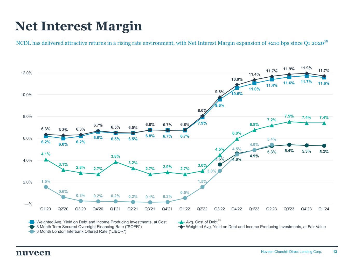 13Nuveen Churchill Direct Lending Corp. NCDL has delivered attractive returns in a rising rate environment, with Net Interest Margin expansion of +210 bps since Q1 202028 Net Interest Margin 6.2% 6.0% 6.2% 6.6% 6.5% 6.5% 6.8% 6.7% 6.7% 7.9% 9.6% 10.6% 11.0% 11.4% 11.6% 11.7% 11.6% 4.1% 3.1% 2.8% 2.7% 3.8% 3.2% 2.7% 2.9% 2.7% 3.0% 4.5% 6.0% 6.8% 7.2% 7.5% 7.4% 7.4% 3.6% 4.6% 4.9% 5.3% 5.4% 5.3% 5.3% 6.3% 6.3% 6.3% 6.7% 6.5% 6.5% 6.8% 6.7% 6.8% 8.0% 9.8% 10.9% 11.4% 11.7% 11.9% 11.9% 11.7% 1.5% 0.6% 0.3% 0.2% 0.2% 0.2% 0.1% 0.2% 0.5% 1.5% 3.0% 4.5% 4.9% 5.4% Weighted Avg. Yield on Debt and Income Producing Investments, at Cost Avg. Cost of Debt 3 Month Term Secured Overnight Financing Rate ("SOFR") Weighted Avg. Yield on Debt and Income Producing Investments, at Fair Value 3 Month London Interbank Offered Rate ("LIBOR") Q1'20 Q2'20 Q3'20 Q4'20 Q1'21 Q2'21 Q3'21 Q4'21 Q1'22 Q2'22 Q3'22 Q4'22 Q1'23 Q2'23 Q3'23 Q4’23 Q1’24 —% 2.0% 4.0% 6.0% 8.0% 10.0% 12.0% 29