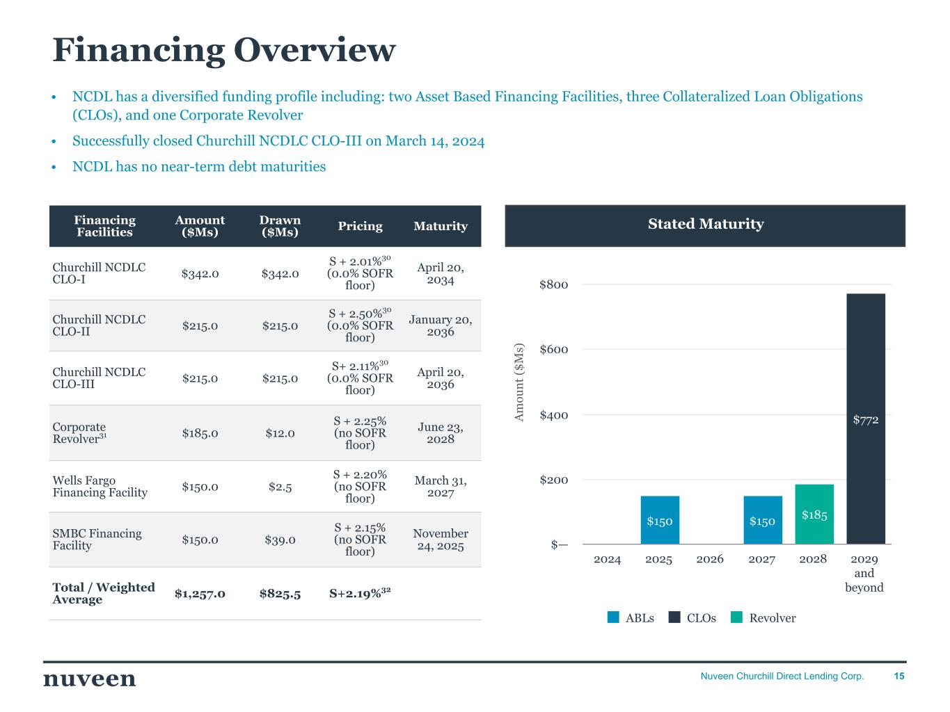 15Nuveen Churchill Direct Lending Corp. Financing Overview Financing Facilities Amount ($Ms) Drawn ($Ms) Pricing Maturity Churchill NCDLC CLO-I $342.0 $342.0 S + 2.01%30 (0.0% SOFR floor) April 20, 2034 Churchill NCDLC CLO-II $215.0 $215.0 S + 2.50%30 (0.0% SOFR floor) January 20, 2036 Churchill NCDLC CLO-III $215.0 $215.0 S+ 2.11%30 (0.0% SOFR floor) April 20, 2036 Corporate Revolver31 $185.0 $12.0 S + 2.25% (no SOFR floor) June 23, 2028 Wells Fargo Financing Facility $150.0 $2.5 S + 2.20% (no SOFR floor) March 31, 2027 SMBC Financing Facility $150.0 $39.0 S + 2.15% (no SOFR floor) November 24, 2025 Total / Weighted Average $1,257.0 $825.5 S+2.19%32 • NCDL has a diversified funding profile including: two Asset Based Financing Facilities, three Collateralized Loan Obligations (CLOs), and one Corporate Revolver • Successfully closed Churchill NCDLC CLO-III on March 14, 2024 • NCDL has no near-term debt maturities A m ou n t ($ M s) $150 $150 $772 $185 ABLs CLOs Revolver 2024 2025 2026 2027 2028 2029 and beyond $— $200 $400 $600 $800 $1,000 Stated Maturity