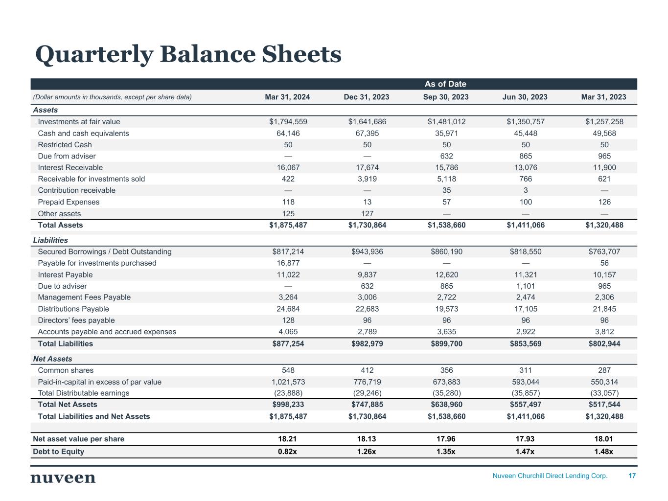 17Nuveen Churchill Direct Lending Corp. As of Date (Dollar amounts in thousands, except per share data) Mar 31, 2024 Dec 31, 2023 Sep 30, 2023 Jun 30, 2023 Mar 31, 2023 Assets Investments at fair value $1,794,559 $1,641,686 $1,481,012 $1,350,757 $1,257,258 Cash and cash equivalents 64,146 67,395 35,971 45,448 49,568 Restricted Cash 50 50 50 50 50 Due from adviser — — 632 865 965 Interest Receivable 16,067 17,674 15,786 13,076 11,900 Receivable for investments sold 422 3,919 5,118 766 621 Contribution receivable — — 35 3 — Prepaid Expenses 118 13 57 100 126 Other assets 125 127 — — — Total Assets $1,875,487 $1,730,864 $1,538,660 $1,411,066 $1,320,488 Liabilities Secured Borrowings / Debt Outstanding $817,214 $943,936 $860,190 $818,550 $763,707 Payable for investments purchased 16,877 — — — 56 Interest Payable 11,022 9,837 12,620 11,321 10,157 Due to adviser — 632 865 1,101 965 Management Fees Payable 3,264 3,006 2,722 2,474 2,306 Distributions Payable 24,684 22,683 19,573 17,105 21,845 Directors’ fees payable 128 96 96 96 96 Accounts payable and accrued expenses 4,065 2,789 3,635 2,922 3,812 Total Liabilities $877,254 $982,979 $899,700 $853,569 $802,944 Net Assets Common shares 548 412 356 311 287 Paid-in-capital in excess of par value 1,021,573 776,719 673,883 593,044 550,314 Total Distributable earnings (23,888) (29,246) (35,280) (35,857) (33,057) Total Net Assets $998,233 $747,885 $638,960 $557,497 $517,544 Total Liabilities and Net Assets $1,875,487 $1,730,864 $1,538,660 $1,411,066 $1,320,488 Net asset value per share 18.21 18.13 17.96 17.93 18.01 Debt to Equity 0.82x 1.26x 1.35x 1.47x 1.48x Quarterly Balance Sheets